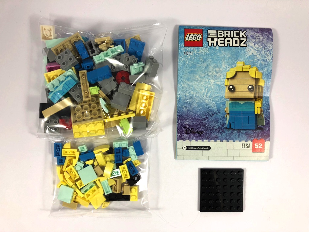 La boîte est au format classique de ces BrickHeadz à l’unité, avec sa languette à déchirer pour l’ouvrir par le bas. Notre princesse y est présentée à l’avant sur un fond glacé (logique), son nom et son numéro (52) étant dans la partie inférieure. Sur le côté, on trouve une image du personnage de fiction made in Disney, tandis qu’à l’arrière on la retrouve avec son socle, aux côtés d’Anna & Olaf du set 41618.