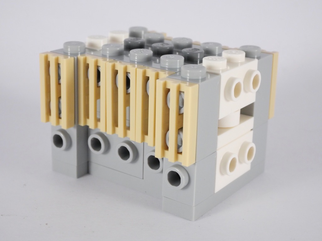 Ils commencent avec un troisième morceau de structure, essentiellement composé de briques SNOT habillées de part et d’autre des 24 premières grilles couleur tan. Puis on construit 2 sous-ensembles, puis 2 autres, que l’on ajoute sur les côtés du building. Ces derniers forment les deux accès principaux du bâtiment, dont celui par lequel arrivent les visiteurs situé sur la 5ème avenue.