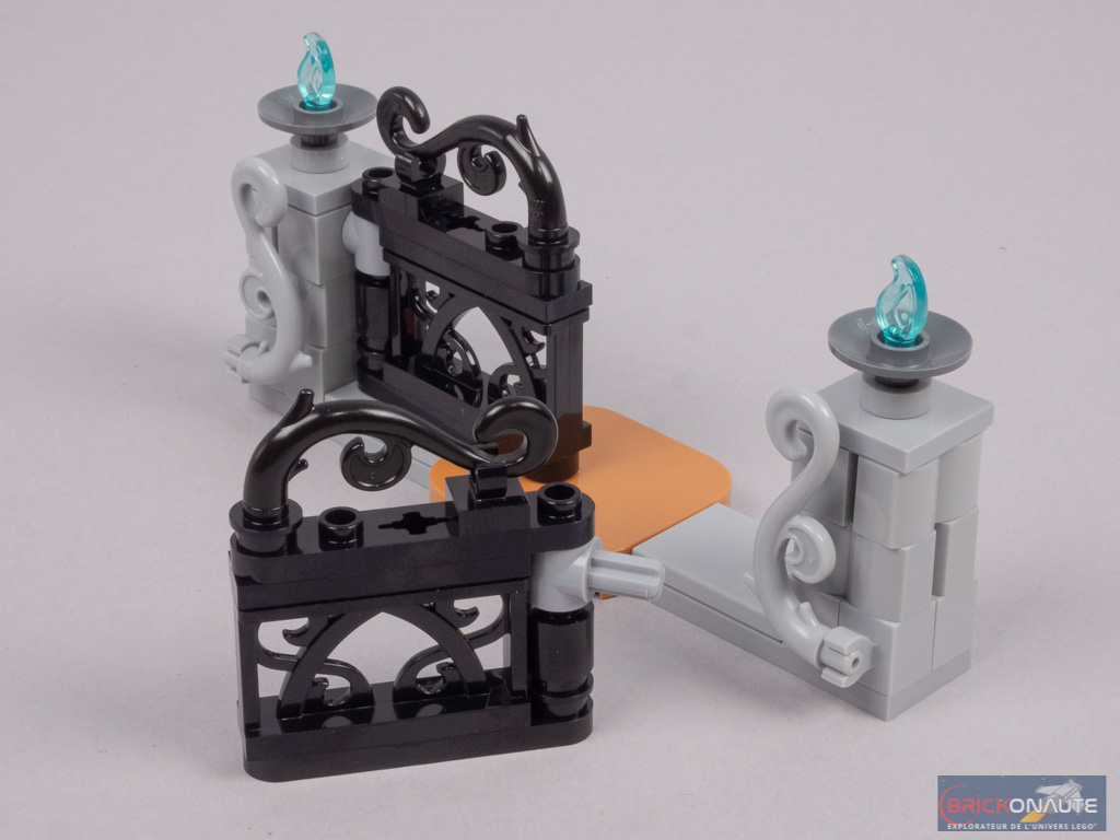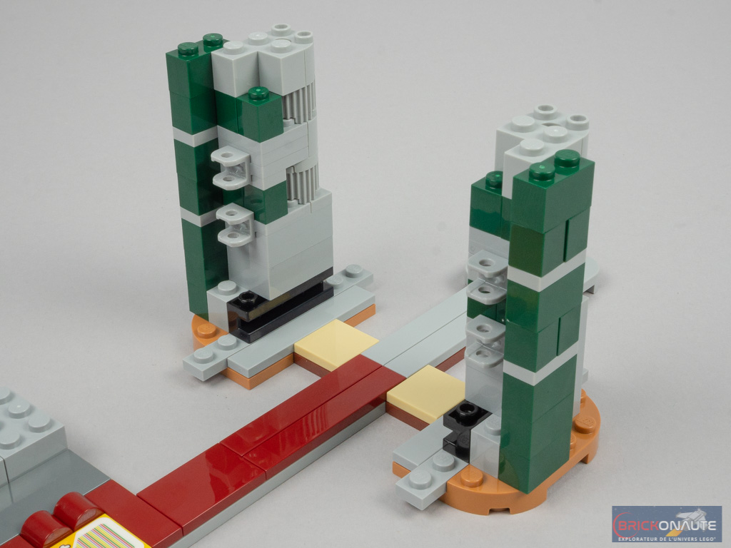 Nous continuons avec le portail d’entrée. Les deux pilastres sont constituées de briques texturées pour un joli effet « pierre ». Les deux vantaux sont joliment ouvragés, et articulés sur un pin. Le portail peut s’ouvrir invariablement dans un sens ou dans l’autre. On construit également la plateforme de départ, qui comporte le même code-barres que celle des sets 71397 et 71401.