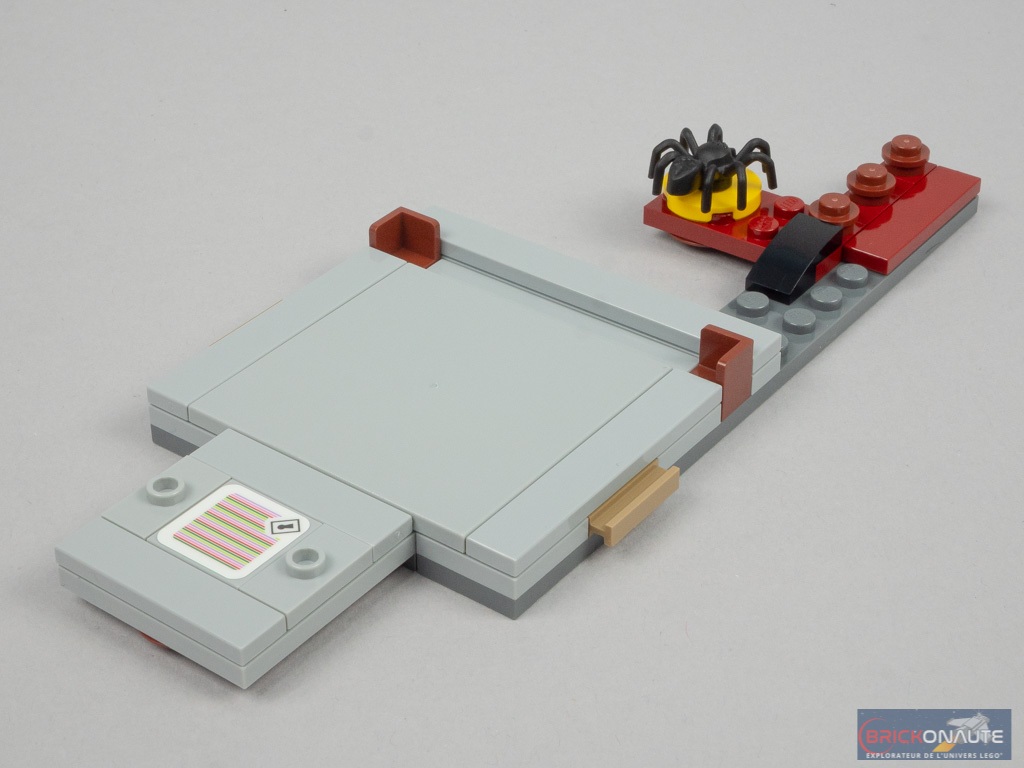Nous construisons ensuite la plateforme qui servira au mécanisme de la porte. Côté extérieur, elle porte un code-barres qui servira simplement à déclencher une animation. Côté intérieur, une araignée protègera l’os doré de l’Ectochien. La plateforme centrale dispose d’un rail dans lequel seront insérés les deux battants de la porte. Enfin, sur l’extérieur, on remarque les deux petits door rails qui s’inséreront dans les glissières noires visibles sur la photo au-dessus.