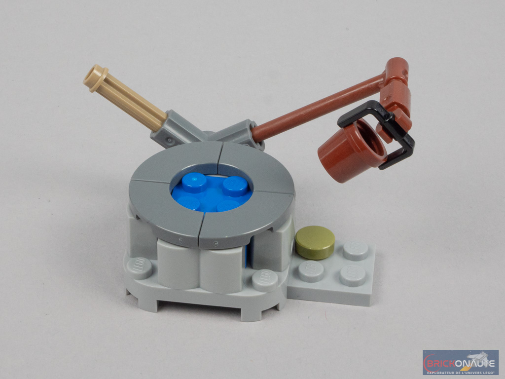 L’assemblage suivant est tout simple : il s’agit d’un petit puits, avec un seau à soulever en tapant sur un levier, afin de libérer la tile d’entrée du manoir. On construit ensuite les deux battants de porte, sur lesquels vous remarquerez la petite boule, qui viendra s’insérer dans le rail de la plateforme assemblée précédemment. Côté intérieur, c’est un engrenage qui s’insère entre les petites round plates solidaires de la plateforme, et qui permettra de refermer la porte.