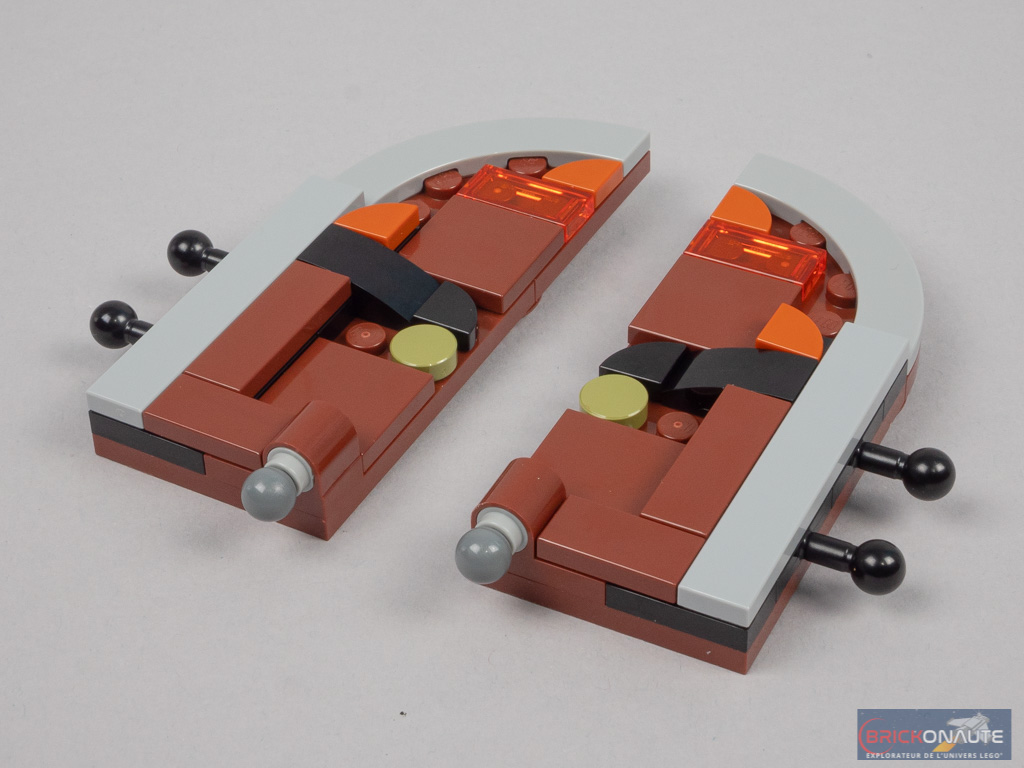 Nous nous attaquons alors au morceau « principal » du set, qui s’étalera jusqu’à la fin de la construction. On commence par relier plusieurs plateformes entre elles : une qui se situera devant la porte, une derrière avec la récompense pour l’Ectochien (un os doré), et deux autres pour les montants de la porte. Remarquez ici la surface tilée : une plateforme viendra coulisser sur l’ensemble. Nous continuons avec les montants de la porte, particulièrement ouvragés sur l’extérieur, et le design est franchement sympa. Côté intérieur, on retrouve deux points de fixation pour chaque battant.