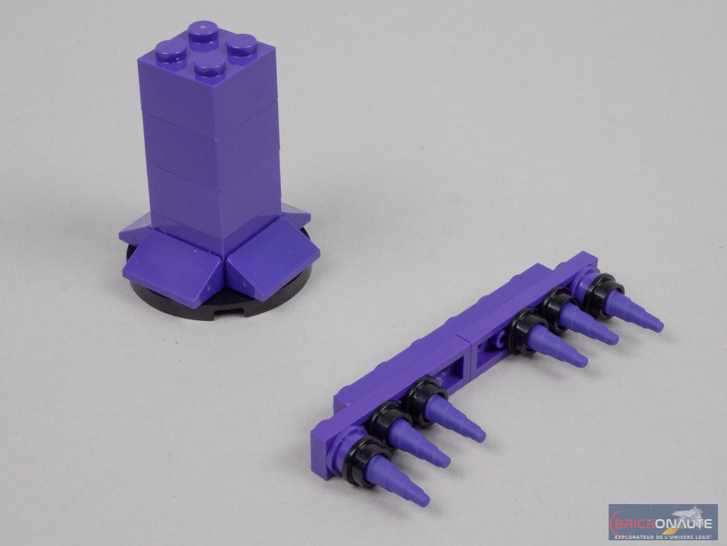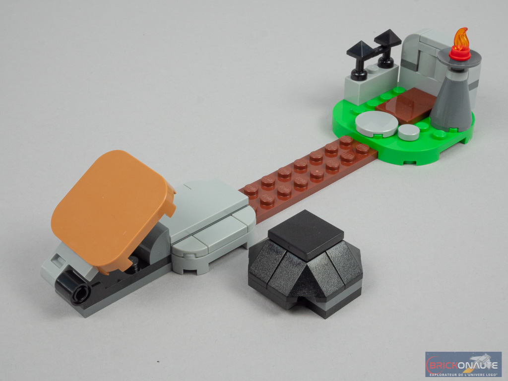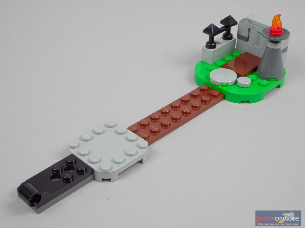 Nous attaquons le sachet n°2 par la construction de la plateforme qui accueillera M. Marais. On y retrouve une pierre tombale, ainsi qu’un morceau de mur et de clôture, et une vasque enflammée. Du côté opposé à cette plateforme, on construit le dispositif qui permettra de vaincre ce vilain fantôme. La conception est assez simple : en tapant sur la plateforme marron articulée sur un pin Technic, on éjecte une pierre noire qui sert à faire tomber M. Marais. Il s’agit d’une référence au jeu vidéo, où il faut lancer des boules noires sur le fantôme à l’aide de l’Ectoblast.