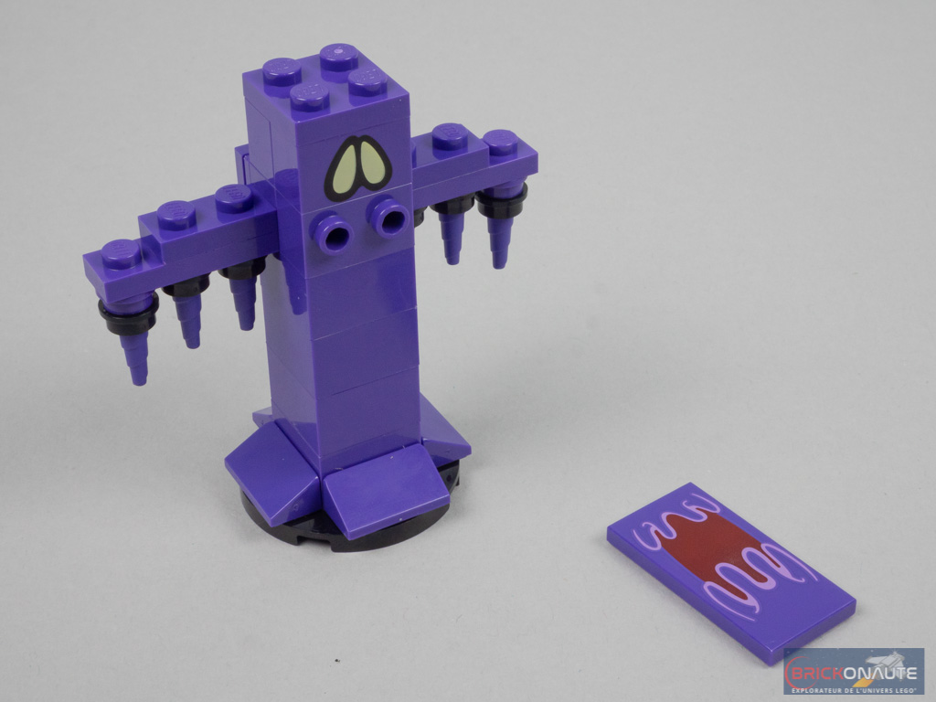 On commence par la construction de M. Marais, l’Ombre du Cimetière (Bogmire, the Cemetery Shadow), ce grand fantôme violet – le boss de la deuxième zone de Luigi’s Mansion. Sa conception est assez simple – remarquez ici surtout l’utilisation de cornes de licornes pour la réalisation de ses bras dégoulinants. Il porte une tile avec un code-barres dans son dos. Il ne suffit pas de lui sauter dessus pour le vaincre. Il faudra, au choix, disposer d’une étoile d’invincibilité ou de l’Ectoblast. La première solution est plus expéditive et permet de le vaincre en un seul coup. Mais aucune de ces deux solutions n’est disponible dans le set – il sera donc en quelque sorte invincible si vous ne possédez que ce dernier.