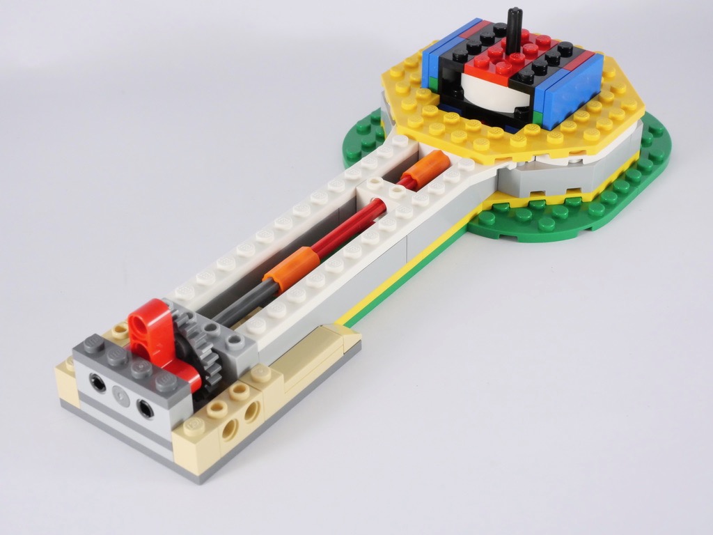 On passe alors au manège à proprement parler. Celui-ci est assemblé sur une base de 12×12 tenons arrondie dans les angles. Cette base est prolongée sur un des côtés pour abriter le mécanisme qui permet de faire tourner le manège grâce à la manivelle. Ce mécanisme est très simple : quelques engrenages, une manivelle et une turntable. Il est caché par un ensemble de pièces jaunes.