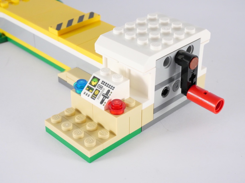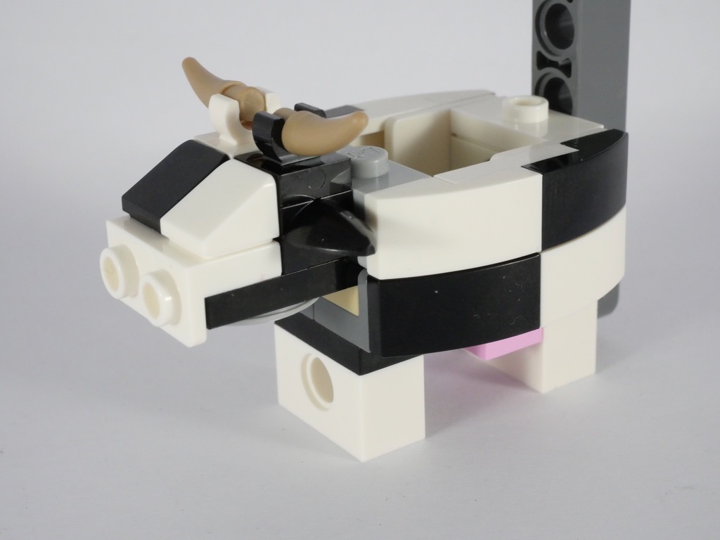 Le design est plutôt réussi et bourré de détails, jusqu’aux mamelles de la vache et au petit bonhomme vert dans sa soucoupe volante. Les constructions annexes sont assez anecdotiques, mais elles ont le mérite d’exister. Seul petit regret : cette excroissance jaune, et ce pupitre de commande sans aucune finition ou presque… C’est un peu dommage : même si le mécanisme est nécessaire, on aurait apprécié une autre manière de le dissimuler.
