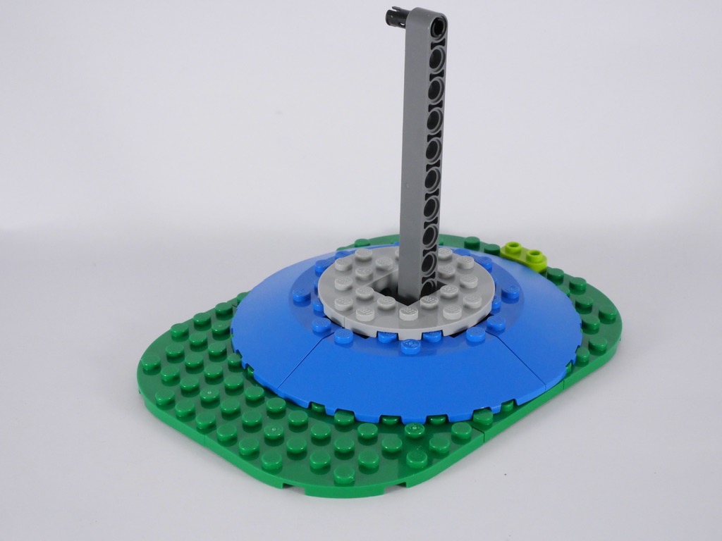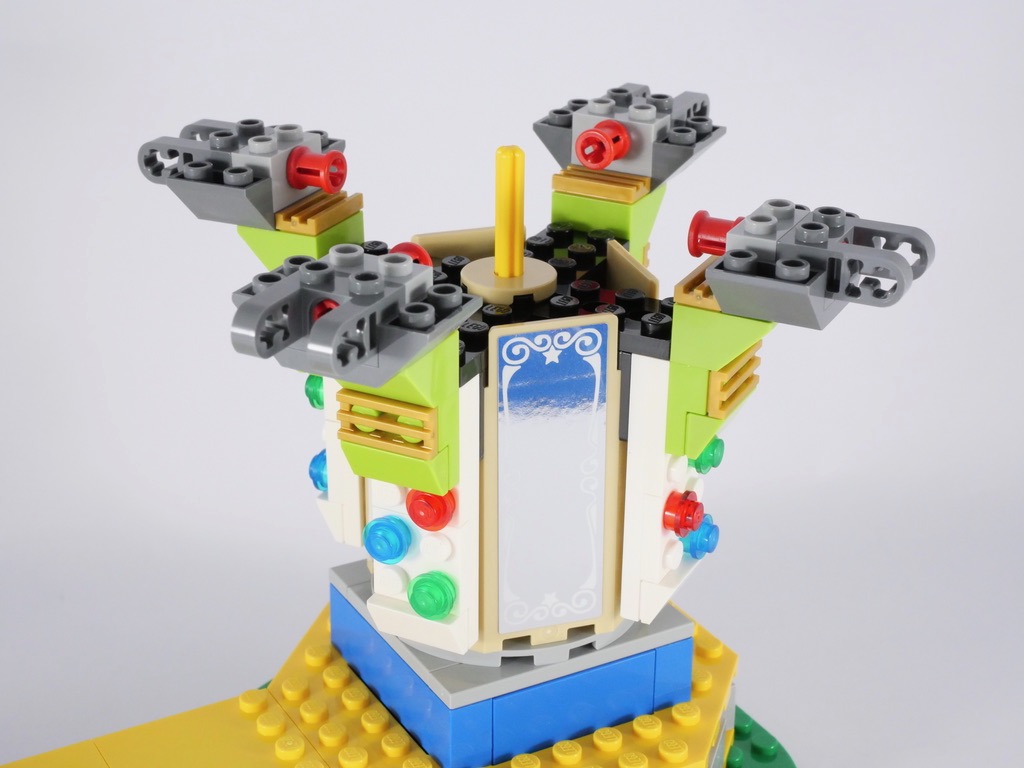 On passe alors au manège principal. Il est assemblé sur une base de 12×14 tenons, de laquelle dépassent deux beams Technic soutenant un cube abritant le mécanisme. On y ajoute la « roue » (une croix avec un cercle en son centre, puis on termine avec les 4 nacelles individuelles pour les visiteurs.