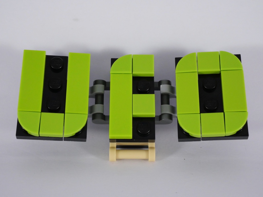 Touche finale et détail qui tue : la soucoupe volante au sommet, avec le petit bonhomme vert aux commandes, et le mot UFO (OVNI en anglais) écrit avec des tiles couleur lime.
