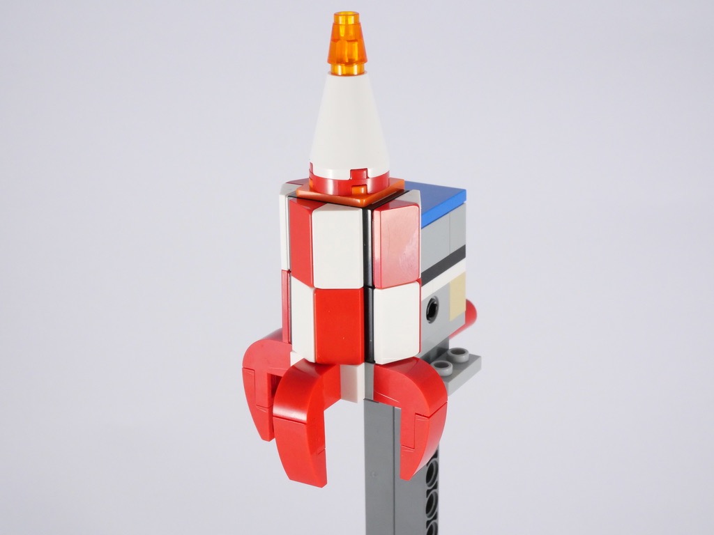 Comme vous pouvez le constater, ce second modèle est nettement plus sommaire que le premier, et manque clairement de finitions. Entre les deux tenons qui dépassent en partie haute (sur la photo de la fusée), une fusée plus carrée que ronde, et un service minimum au niveau de la base, c’est assez dommage. D’autant plus lorsqu’on voit le nombre de pièces restantes à la fin…