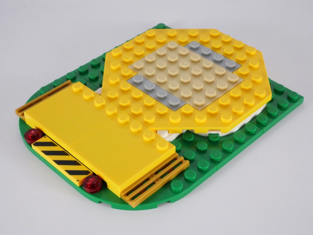 On s’attaque alors au manège principal, cette fois-ci une tour de chute libre. Elle est assemblée sur une base de 12×16 tenons, aux coins arrondis. Une structure Technic est construite au milieu et permet le maintien de l’axe principal sur lequel viendra coulisser la nacelle des visiteurs. Cette base est décorée, assez sommairement, de quelques marches et loupiotes.
