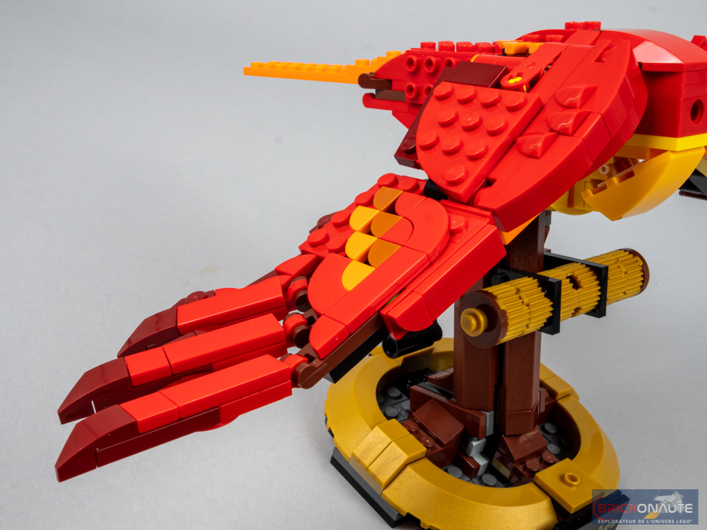 Commençons par le design de l’ensemble. Et sur ce point, c’est presque parfait. Le socle et son perchoir doré, la réalisation des plumes et de la tête, le mélange de couleur vives et de pearl gold, les serres… c’est du tout bon. En trouvant le bon équilibre, on peut disposer Fumseck avec les ailes déployées, même si la gravité aura tendance à les faire retomber facilement.