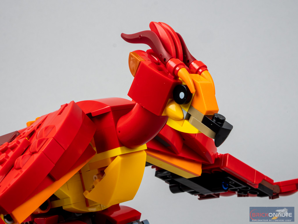 Vous vous en doutez : on commence le 4ème et dernier sachet de pièces avec la suite de l’habillage de l’aile droite. On habille le corps de quelques tiles et slopes en guise de plumes puis on s’intéresse à la queue. On y attache 4 longs sous-ensembles sur des clips pour lui donner sa forme particulière. Les serres sont très joliment réalisées à base de… cornes de vaches ! Les deux pattes sont articulées on pourra donc « poser » Fumseck sur son perchoir. On termine notre construction avec un dernier sous-assemblage pour la tête. Celle-ci est orientable : elle est fixée sur un ball joint.