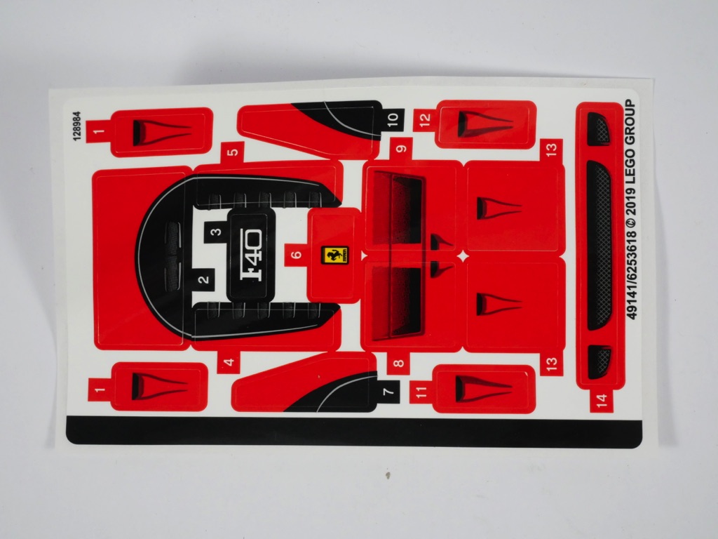 On continue avec l’arrière, à commencer par la monstrueuse sortie d’échappement, puis les feux là encore brick built par des tiles rondes translucides. Seul le numéro de modèle (F40) est un sticker collé au milieu. On ajoute alors la lunette arrière (assemblage de tiles translucides également) et quelques slopes décorées de stickers. L’ajout de l’aileron noir achève la construction de l’arrière de la voiture.