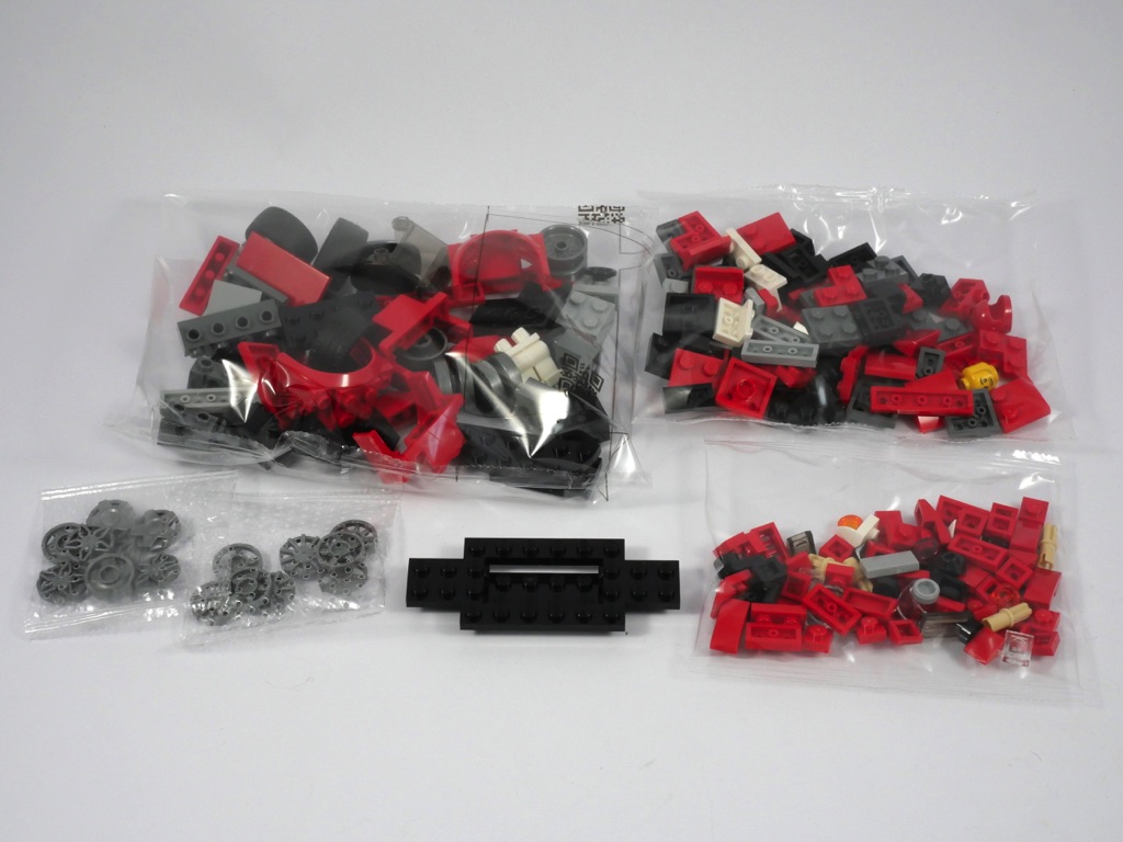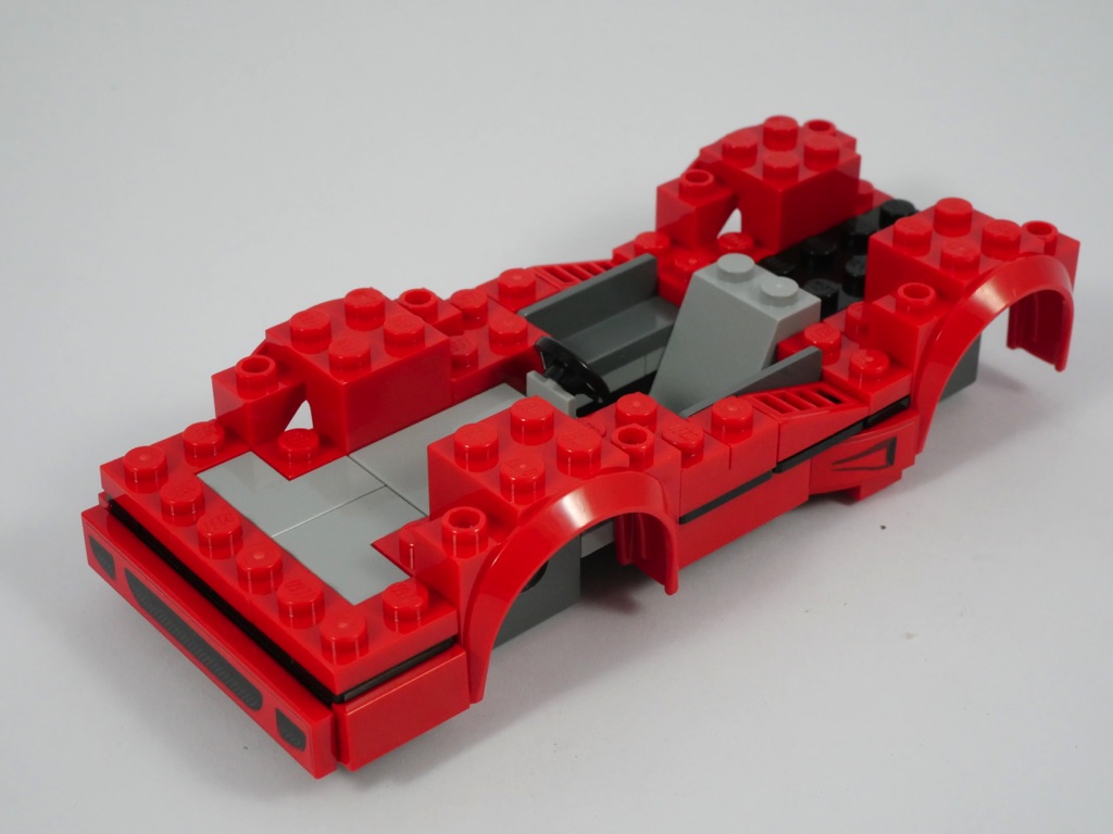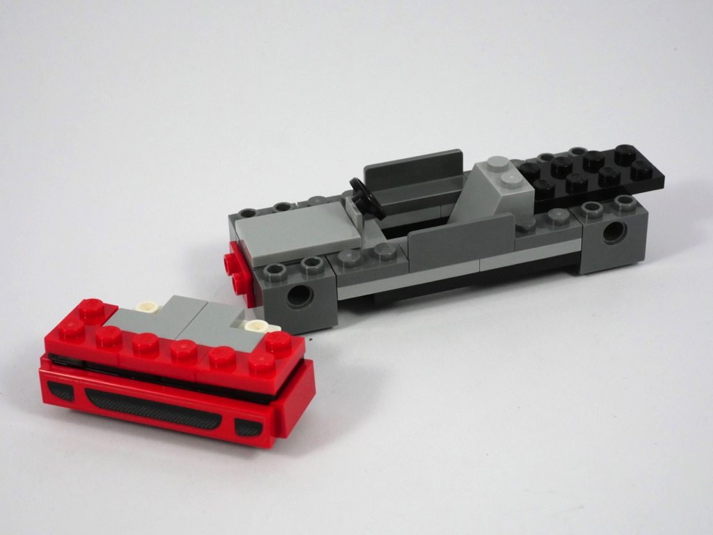 Une trentaine de minutes suffisent à venir à bout du modèle. La construction est plutôt simple. On commence par habiller le châssis en créant l’habitacle, puis on passe sur le bouclier avant. Il s’agit simplement d’une tile rouge décorée d’un autocollant, fixée sur des briques SNOT. Les portières sont intelligemment réalisées : un petit espace subsiste dans leur partie supérieure comme pour la voiture originale. Et tout çà sans utiliser d’autocollant.