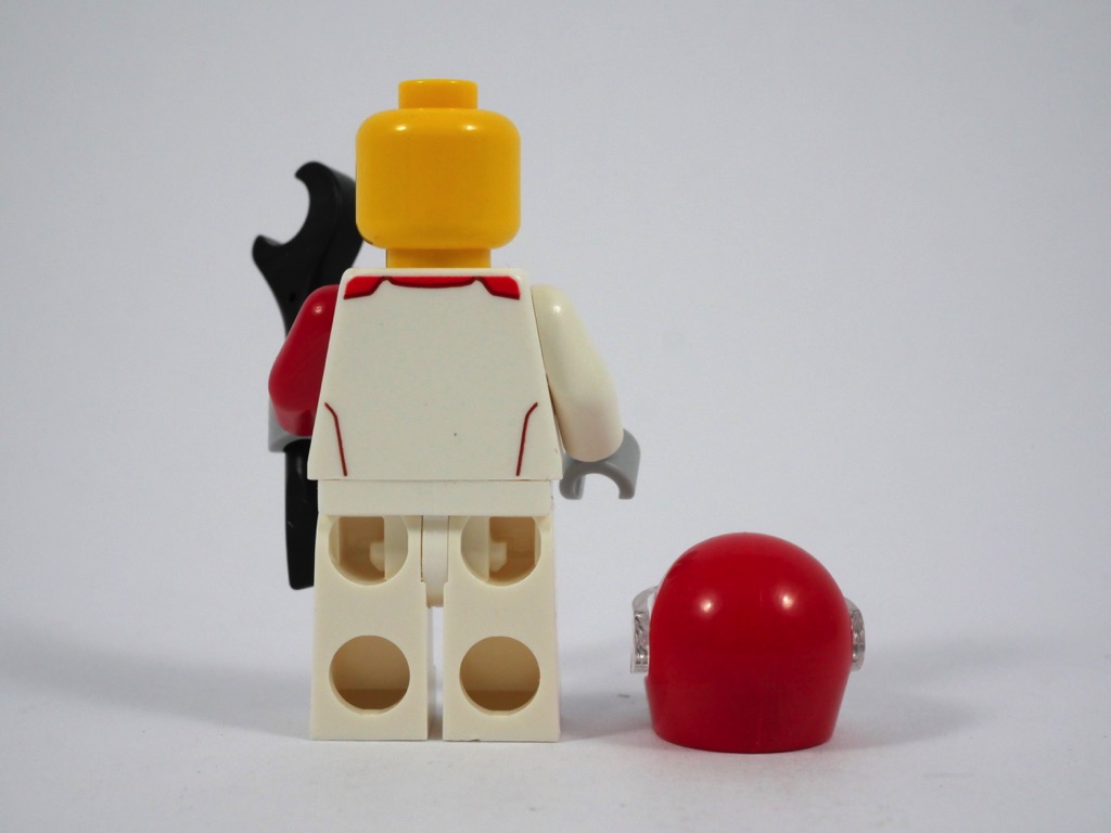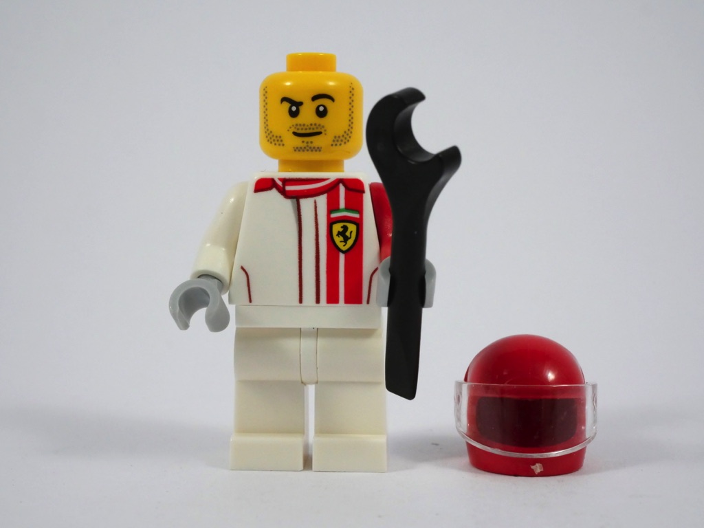 Comme toujours dans ces petites boîtes, nous retrouvons le pilote dans sa tenue aux couleurs de la marque. Pantalon blanc monochrome pour lui, et veste de pilotage striée rouge arborant le cheval cabré. On devine même les 3 couleurs du drapeau italien au-dessus de celui-ci. Le dos est également (légèrement) tampographié, avec le col rouge et deux plis en partie basse. Le tout complété d’un visage barbu, d’un casque rouge et d’une clé plate pour réparer la bagnole. Simple et efficace, même si on aurait apprécié un peu plus de travail notamment pour les jambes.