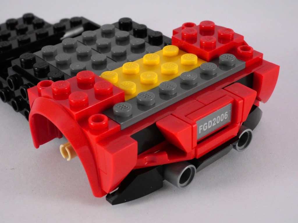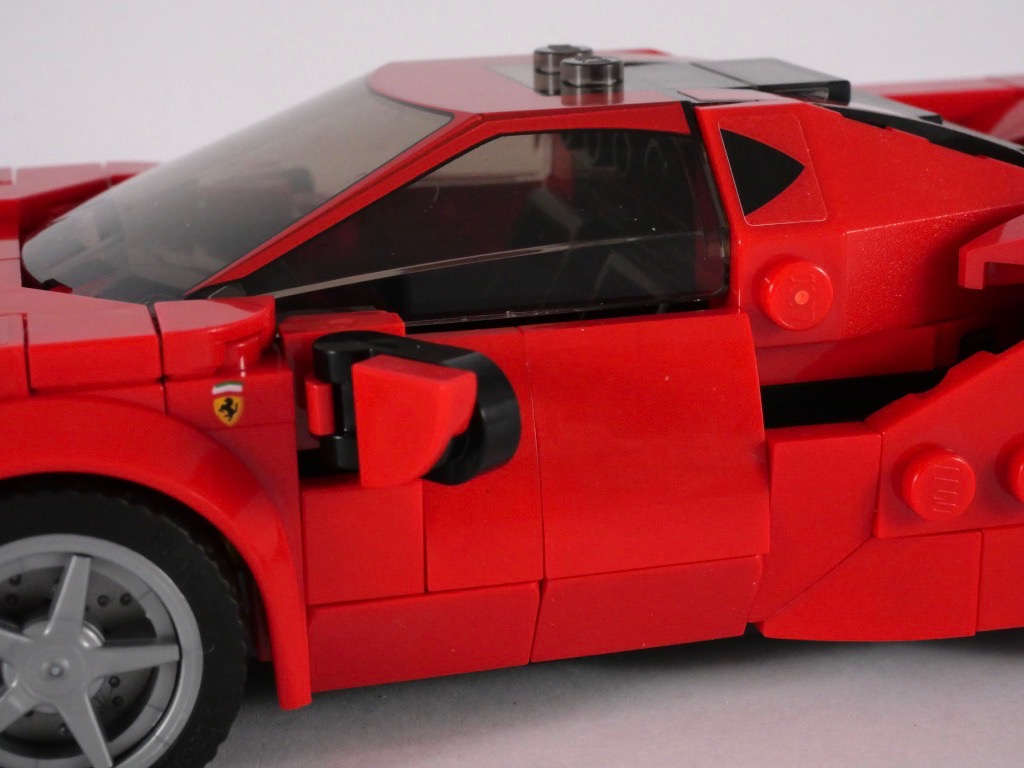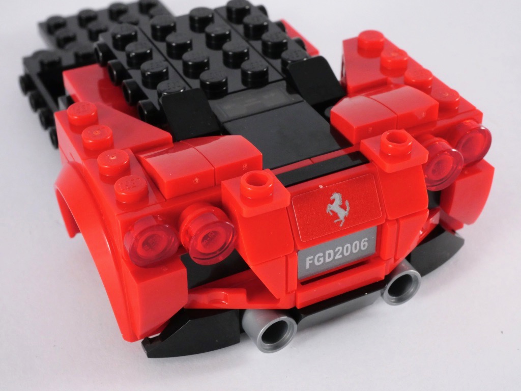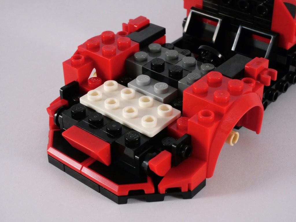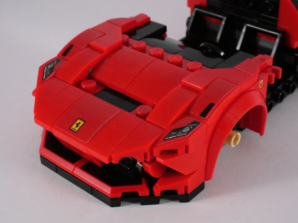 On ajoute les deux passages de roues, puis on continue avec le capot dont les formes si particulières sont habilement reproduites. Des petites plates 1×1 arborent le logo Ferrari sur le côté. On a déjà pu les voir dans le set 75890 – Ferrari F40 Competizione. On ajoute une palanquée d’autocollants sur l’avant. Dommage : les feux ne sont pas brick-built comme à l’arrière. On termine avec les portières, le superbe pare-brise tampographié, et les 4 roues qui disposent d’un jeu de jantes alternatif.