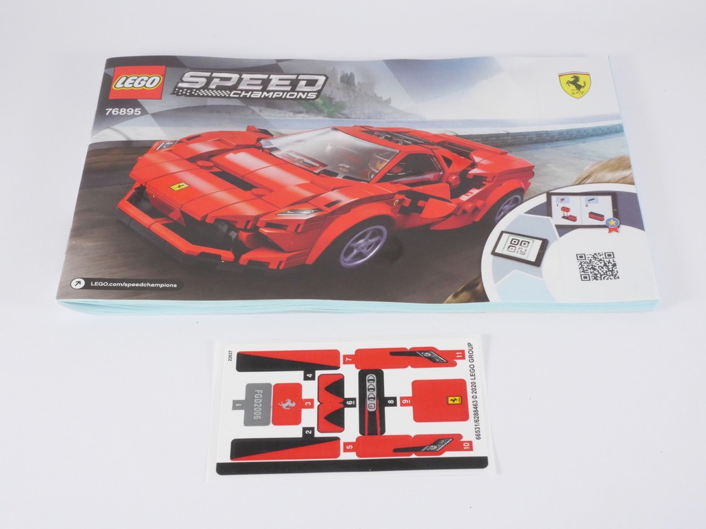Devant contenir plus de pièces, la boîte est légèrement plus grande que celles dont nous avions l’habitude avec les voitures Speed Champions « ancien format » de 6 tenons de large. La Ferrari F8 Tributo nous y est présentée sur une route de bord de mer, on devine un fort dans le lointain. Sur le côté, un petit macaron nous confirme qu’on est en présence d’un produit officiel Ferrari. Au dos, Nous trouvons deux autres images. Une première nous permet de découvrir l’arrière de la machine, et une seconde l’intérieur de l’habitacle avec le pilote aux commandes. Une dernière photo nous montre le vrai bolide italien.