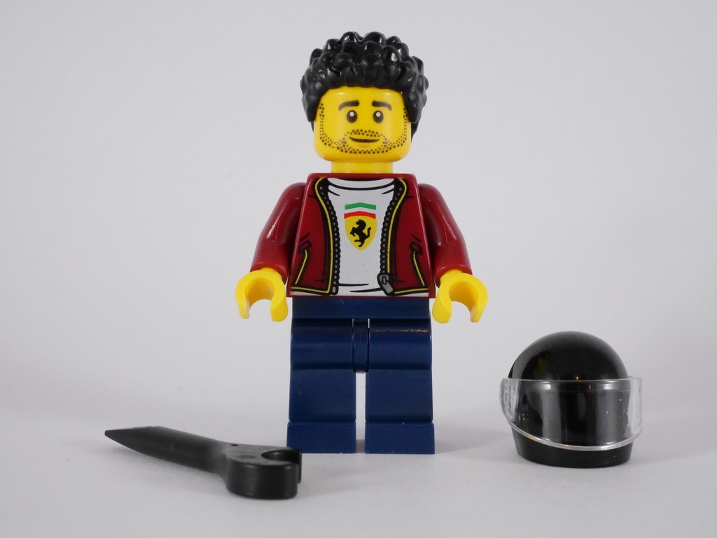 Voilà une chose qui ne change pas des habitudes : la voiture nous est livrée avec son pilote. Son pantalon est monochrome. Il porte un tee-shirt blanc arborant le logo Ferrari, surmonté des 3 couleurs du drapeau italien. Sur sa veste à zip, on devine deux poches sur le torse, et quelques plis dans le dos. C’est bien réalisé, et pour une fois le tee-shirt clair ne m’apparaît pas trop terne. Son visage barbu arbore un large sourire d’un côté, et un ton plus sérieux de l’autre. LEGO nous livre également une coiffure de rechange, en plus de son casque noir.