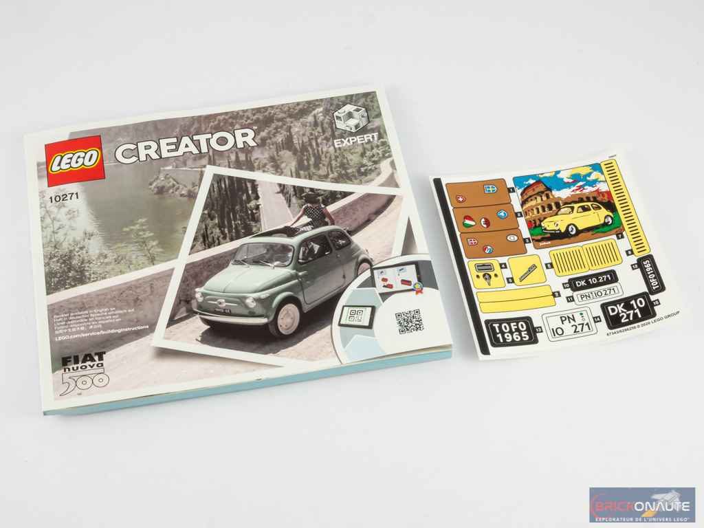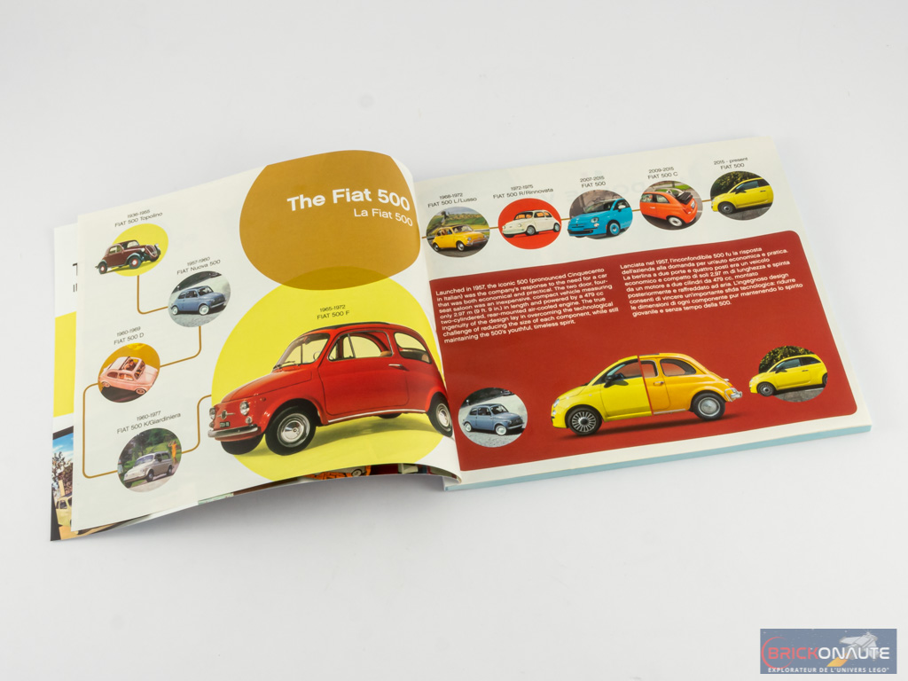 A l’intérieur, nous trouvons 9 sachets de pièces numérotés de 1 à 3 (3 sachets par numéro) et un dernier, tout plat, contenant la capote souple sur une feuille cartonnée. La notice de construction compte 144 pages pour un total de 217 étapes. Elle démarre avec quelques pages retraçant l’histoire de la petite voiture italienne, et quelques mots du designer Pierre Normandin. On trouve enfin une planche de de 17 autocollants dont 6 pour les différentes plaques d’immatriculation.