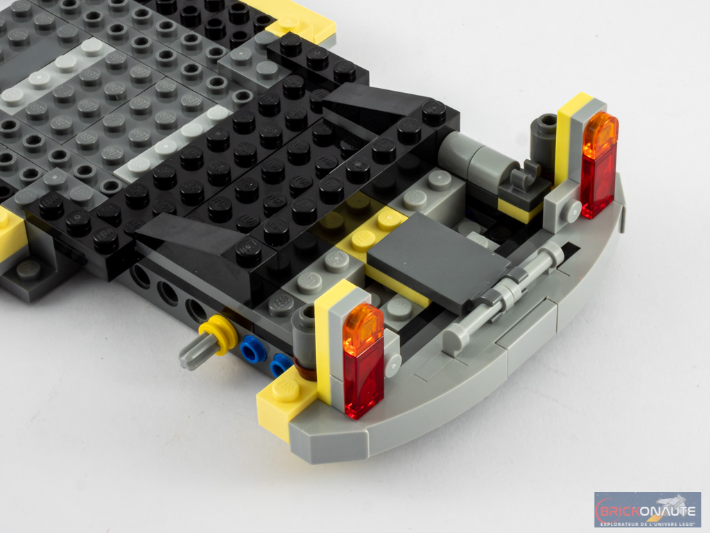 Si vous aimez les véhicules de la gamme LEGO Creator Expert, vous ne serez pas dépaysé par les premières étapes de construction. Le châssis est, comme d’habitude, constitué de pièces Technic sur lesquelles on ajoute un plancher et des axes qui serviront à la fixation des roues. On notera dès cette étape que les roues avant ne seront pas mobiles, faisant du set 10265 Ford Mustang le seul de la gamme à disposer, pour le moment, de ce raffinement. Nous nous occupons alors de l’arrière de la voiture. Nous y ajoutons deux sous-ensembles pour constituer le pare-chocs, les feux et le moteur (oui, il manque une pièce sur certaines des photos ci-dessous – j’ai corrigé le tir un peu plus loin !).