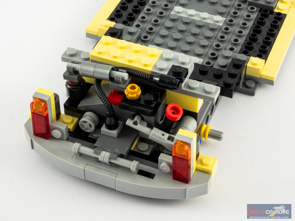 Commençons par les choses agaçantes, surtout dans un modèle destiné à l’exposition comme un véhicule de la gamme LEGO Creator Expert. LEGO a décidément du mal, avec certaines couleurs, à assurer une uniformité de celles-ci. Et le cool yellow (choix sympathique au demeurant) n’échappe pas à la règle – ces différences de couleur étant particulièrement visibles à certains endroits et notamment les portières. Autre sujet, toujours sur les portières : elles disposent de pièces assez « fines » (Plate W. Bow 2X2X2/3) en partie supérieure, directement fixées sur des pièces plus foncées. Et on aperçoit malheureusement ces pièces foncées par transparence ce qui fait un peu moche.