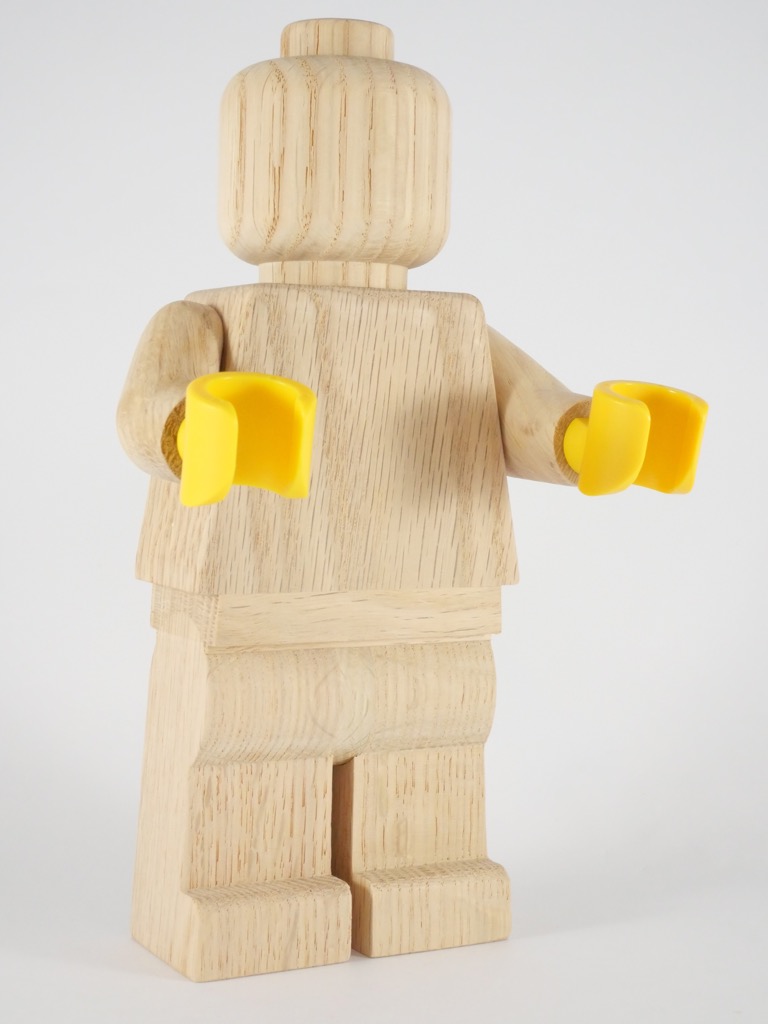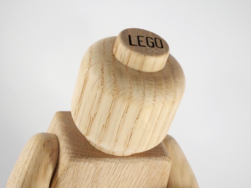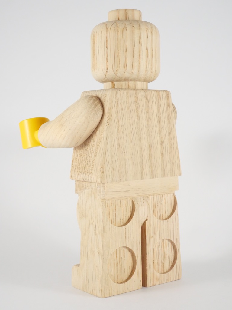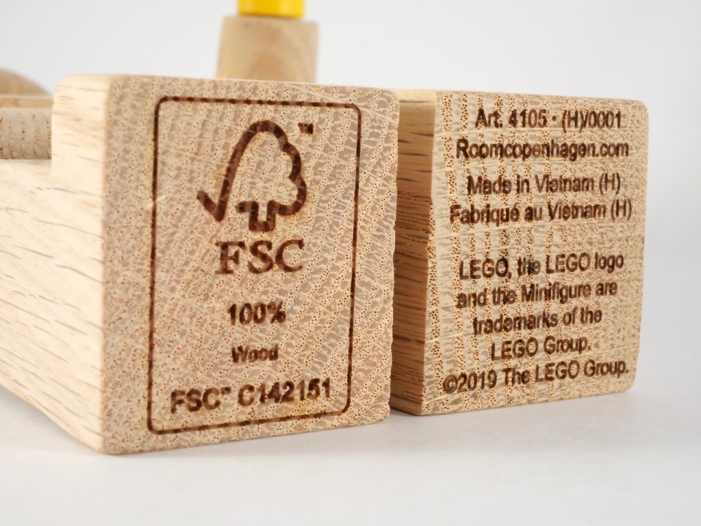 La minifig est réalisée en chêne, et elle est à l’échelle 5:1. Elle mesure donc 20cm de haut. On trouve sur le tenon supérieur de la tête l’inscription LEGO, et sous les pieds nous apprenons qu’il s’agit de bois FSC, garantissant que le bois est issu de forêts gérées d’une façon responsable et durable. On retrouve une confirmation de la fabrication de l’objet au Vietnam sous l’autre pied.