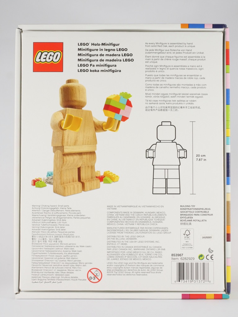Sur l’avant de la boîte, nous ne voyons qu’une demi minifigure. Au dos, nous la voyons entière et tenant dans la main un objet multicolore non identifié (une pomme ?). Un petit encart nous précise que chaque minifig est assemblée à la main à partir de chêne rouge massif, et qu’à ce titre chacune d’entre elles est unique. Un autre encart nous apprend que malgré le prix plutôt élevé de la chose, elle est fabriquée au Vietnam. J’étais peut-être trop naïf de croire que, faisant clairement écho aux origines de la marque, nous aurions le droit à un objet fabriqué au Danemark. Dommage.