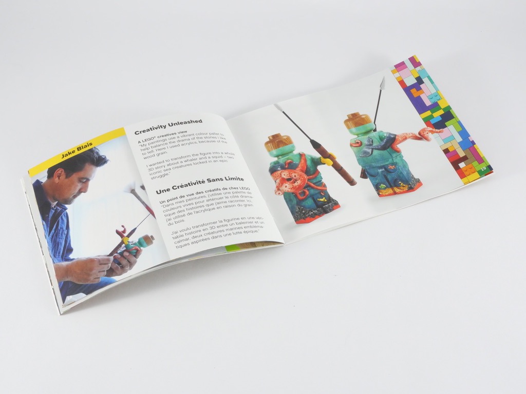 Celui-ci est intégralement en anglais ET en français, on appréciera l’effort. On y trouve quelques éléments d’information sur l’histoire du projet et sur son but final : « célébrer la créativité ». LEGO invite chacun d’entre nous à personnaliser cette minifig, avec le quelques briques fournies mais également en la peignant, l’habillant ou la modifiant comme bon nous semble. Deux designers nous présentent alors leurs propres créations.