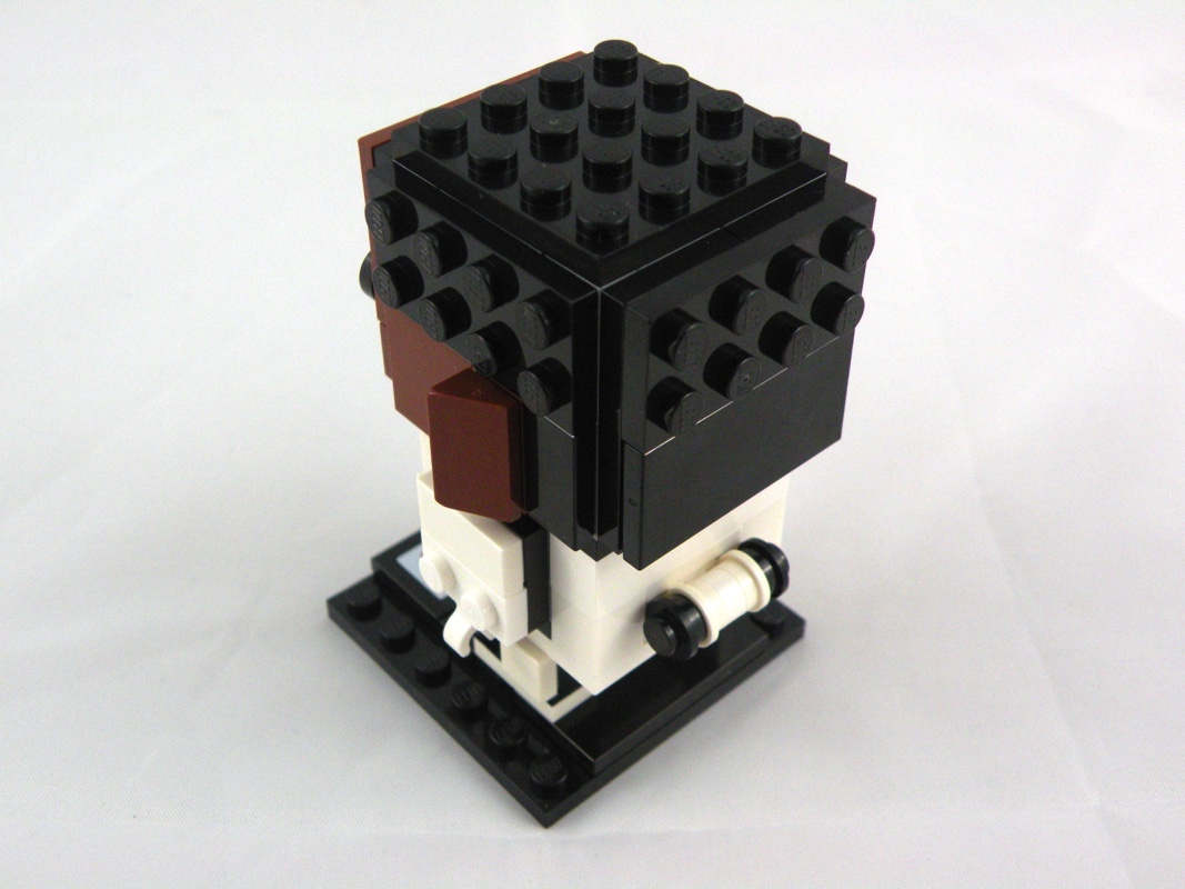 Même principe que pour les autres sets de la gamme pour la tête, composée de 12 Brick, Modified 1 x 2 x 1 2/3 with Studs on 1 Side que l’on vient ensuite habiller. Service minimum ici, avec les tenons apparents pour les cheveux noirs, les deux oreilles, et le visage monochrome sur lequel on retrouve les yeux tampographiés.