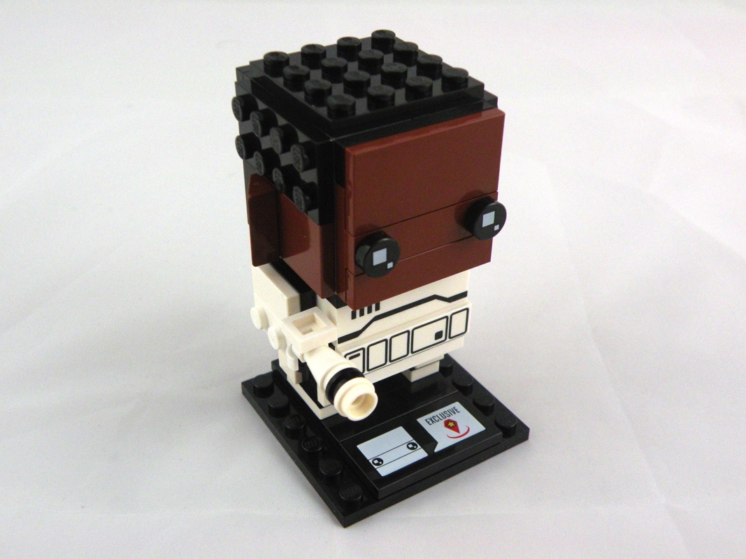 La boîte est au format classique pour les BrickHeadz, et s’organise de la même manière. Sur l’avant, le modèle sans son socle, sur fond orange se dégradant petit à petit. On retrouve le logo de la gamme aux côtés de celui de l’univers Star Wars, et en bas à droite son nom, avec le numéro 19 surmonté de la mention « Exclusive » (sans savoir vraiment la teneur de cette exclusivité). Sur un des côtés, une photo du personnage du film, et de l’autre les mentions légales habituelles. Enfin, sur l’arrière, une seconde vue du modèle prêt à être posé sur son socle, et une troisième aux côtés de son alter ego dont nous parlerons dans un autre article, Captain Phasma.