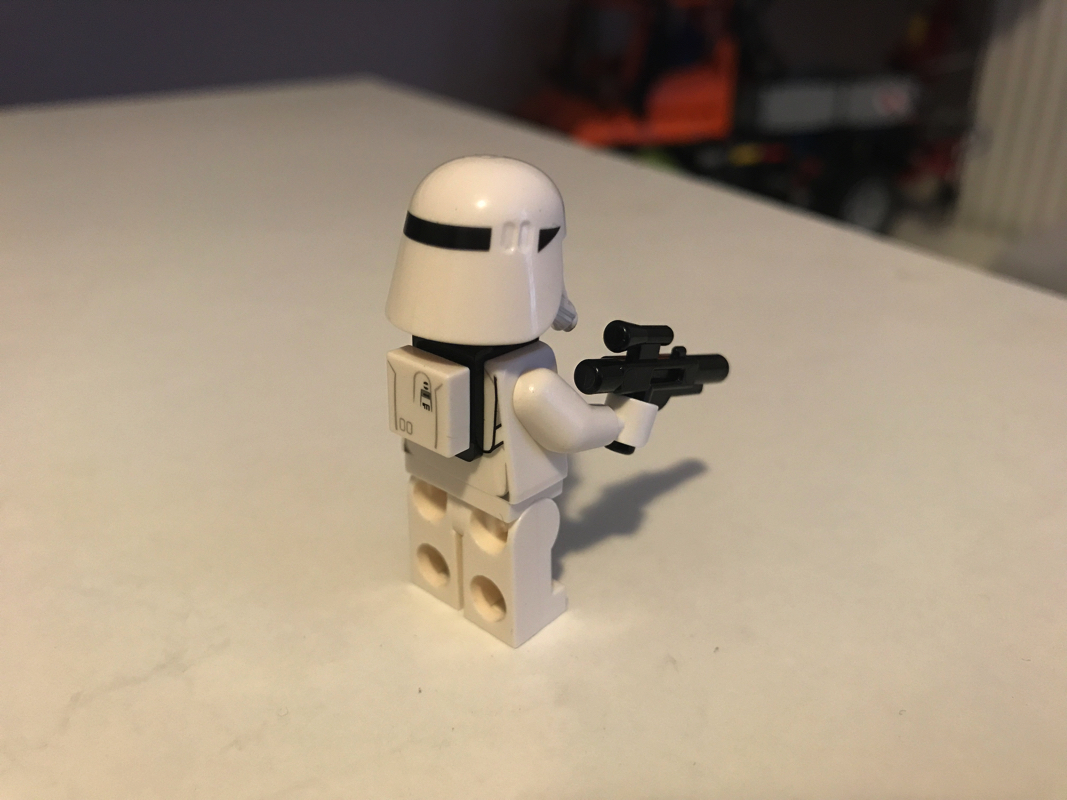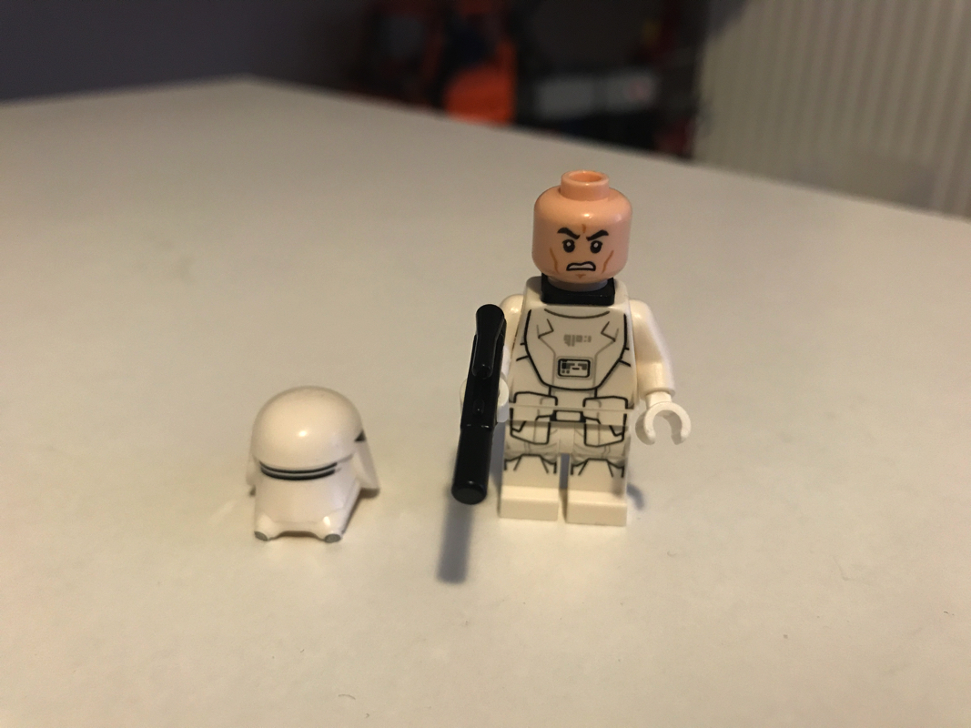 Élément incontournable de cette série de sets : la minifig du pilote de l’engin concerné. Il s’agit ici d’un First Order Snowtrooper. Cette minifig n’est ni nouvelle, ni exclusive, contrairement à celle que l’on trouve dans le set 75125. Le design du casque est très réussi, la tampographie du torse et des jambes également. Un seul visage pour cette minifig, qui se trouvera de toute manière caché sous son casque. Elle porte dans le dos une petite tile 1×1 tampographiée en guise de sac à dos. Une tile supplémentaire est d’ailleurs livrée comme spare part.