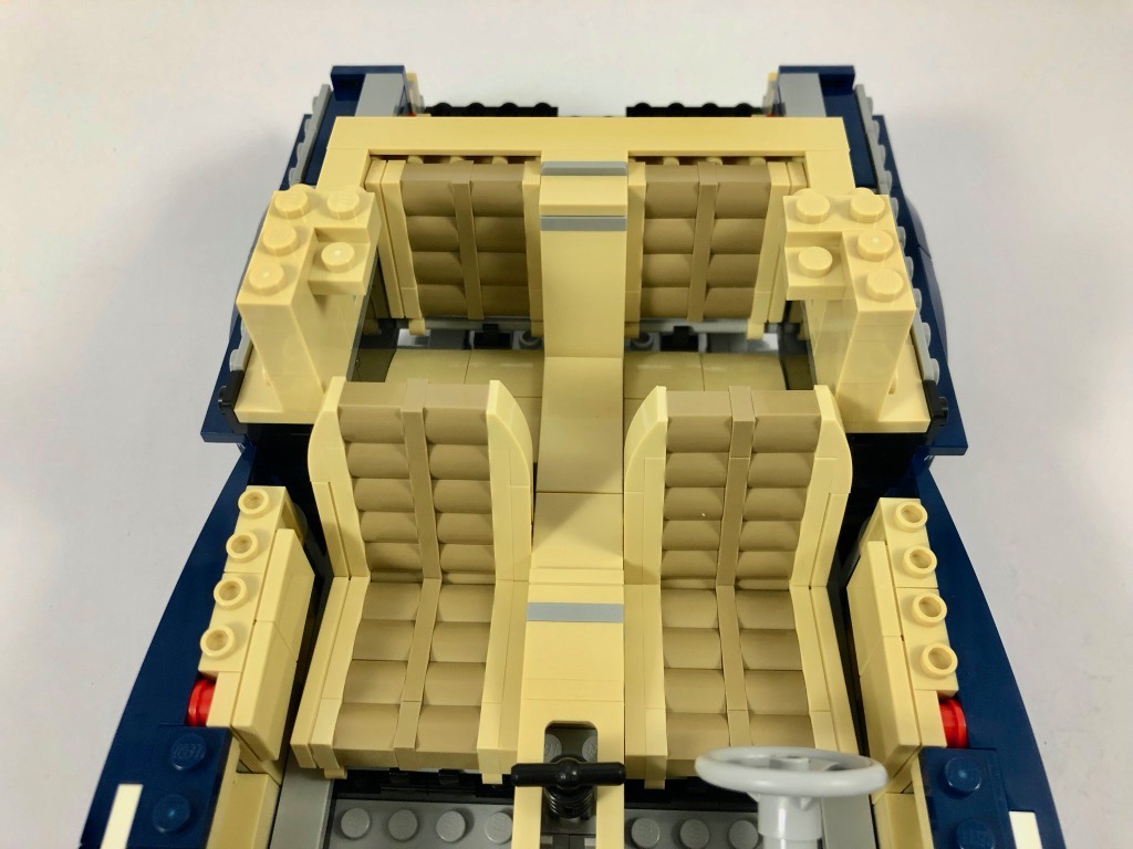 On passe alors à l’intérieur, où l’on construit une partie des sièges arrière et la console centrale avec le levier de vitesses. Celui-ci est « fonctionnel » : il est basé sur une pièce à cliquet qui permet de le positionner comme on le souhaite. Nous commençons alors le moteur, où l’on notera que le bouchon est tampographié, ce qui n’est pas le cas des deux tiles bleues qui le décorent, qui ont droit à un autocollant. Le designer a poussé le concept jusqu’à représenter les durites avec une pièce souple. On ajoute alors une partie du tableau de bord, dont l’autoradio (un sticker), puis le volant rattaché au système de direction par un axe Technic.