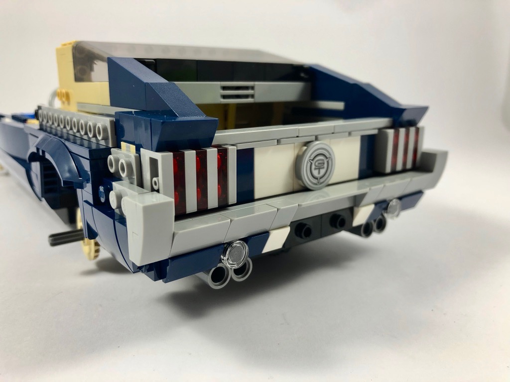 On aménage alors les côtés du coffre, puis la partie basse du pare-chocs arrière. On construit alors la partie située juste au dessus, avec son logo GT (dommage qu’il s’agisse d’un autocollant) et ses superbes feux stops. La conception de tout cet espace est inventive, et vraiment intéressante. On construit alors les deux côtés de l’arrière, tout en courbes grâce à deux grandes slopes. On ajoute le tableau de bord, puis le pare-brise et ses montants.