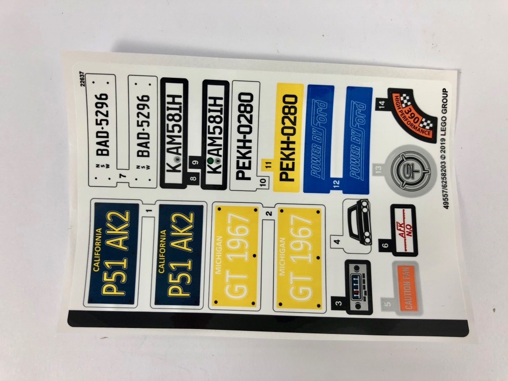 Il est temps d’entamer les deux derniers sachets de pièces, portant le n°6. On commence par assembler le toit (fixé sur deux tenons, de sorte qu’il est très facile de le démonter pour accéder à l’intérieur), puis le coffre, et enfin les deux éléments composant le capot. La bande bleue sur les pièces blanches est également tampographiée. La construction de la Mustang dans sa version « stock » se termine avec l’ajout des 4 roues, où l’on retrouve de superbes jantes à cinq rayons créées pour l’occasion. Petite touche finale : les plaques d’immatriculation. LEGO nous propose cinq choix différents, et autant de tiles pour les autocollants.