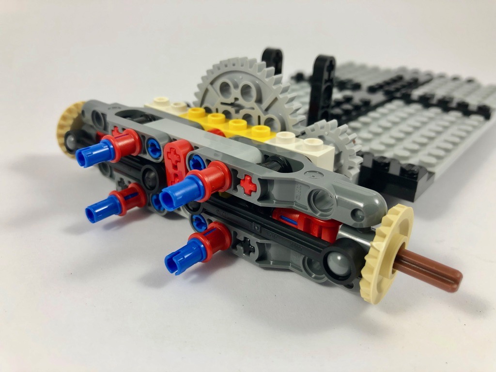 On rallonge ensuite la voiture en lui ajoutant le système qui permettra de surélever l’arrière, basé sur une vis sans fin qui assure l’irréversibilité du mécanisme : même en appuyant sur l’arrière, la voiture ne se rabaissera pas, il faudra se servir de la molette prévue. On termine cette première étape avec quelques briques SNOT et des éléments pour décorer les bas de caisse.