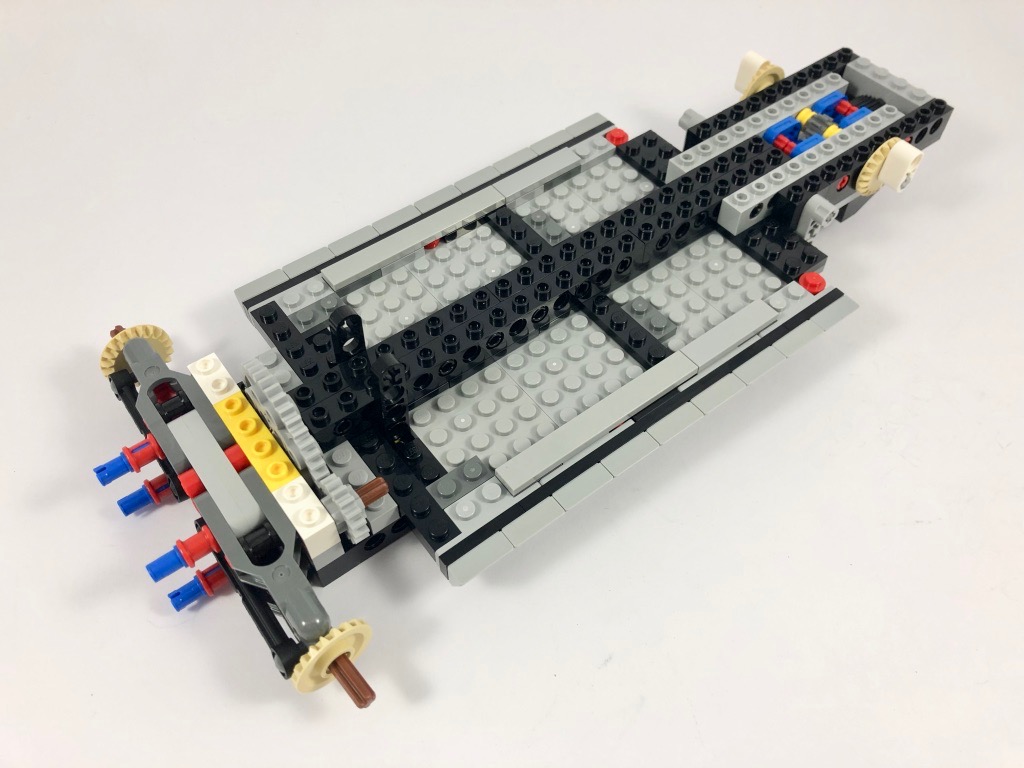 Passons maintenant aux choses sérieuses, et construisons l’engin. Avec les sachets de pièces portant le n°1, nous allons commencer par le châssis dont la rigidité est assurée par des pièces Technic, comme d’habitude dans cette gamme. Après avoir ajouté le plancher, on construit le train avant et son système de direction fonctionnel (une nouveauté appréciable).