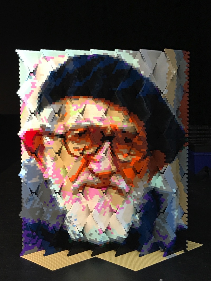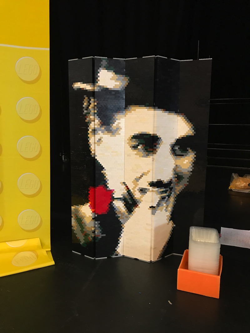Sur la scène prenaient place quelques portraits (mention particulière à celui de l’Abbé Pierre, vraiment superbe), aux côtés de la mosaïque géante sur le thème de Mad Max qui était terminée aujourd’hui. On retrouvait également les différents modèles participant au concours organisé sur le thème de Mad Max.