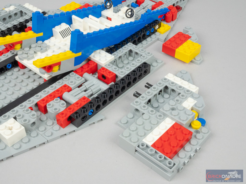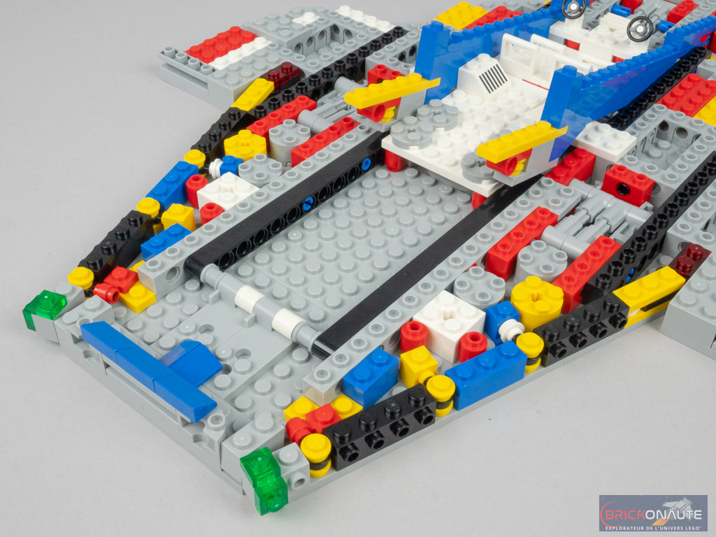 On s’occupe ensuite de « paver » cette structure, ainsi que d’ajouter les « supports » de trains d’atterrissage, qui prennent ici la forme des éléments vus dans la gamme LEGO Super Mario. Tout s’ajuste parfaitement. On ajoute également les sièges et les deux volants (le set de 1979 n’en comptait qu’un) et quelques aménagements intérieurs à la cabine. Sur les côtés, deux sous-ensembles sont fixés sur des pins permettant de trouver l’angle souhaité, c’est très bien pensé.