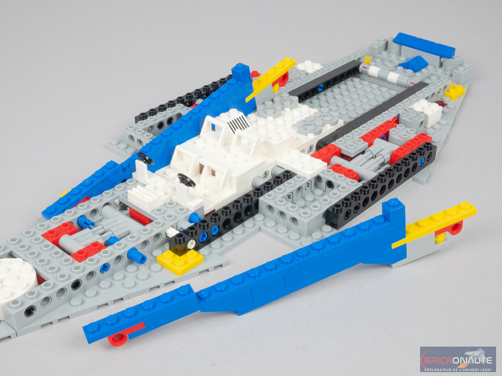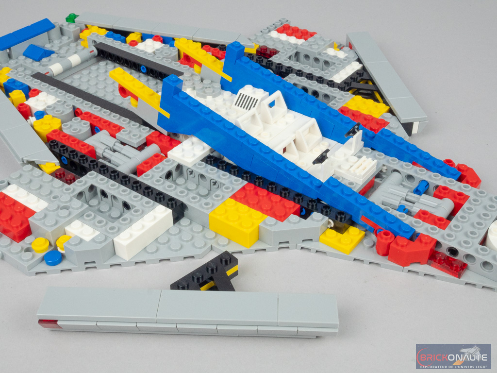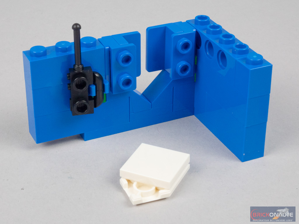 Nous construisons alors deux sous-ensembles (presque) identiques à la symétrie près. Fixés sur des charnières, ils composent les deux moitiés de la soute. L’ensemble est maintenu fermé grâce à des petits clips judicieusement disposés. Côté intérieur, on retrouve deux accessoires : une clef plate et un talkie-walkie. Si la flèche blanche était tampographiée sur le modèle de 1979, elle est ici très astucieusement reproduite à l’aide d’un bouclier Nexo Knights masqué par deux panels.