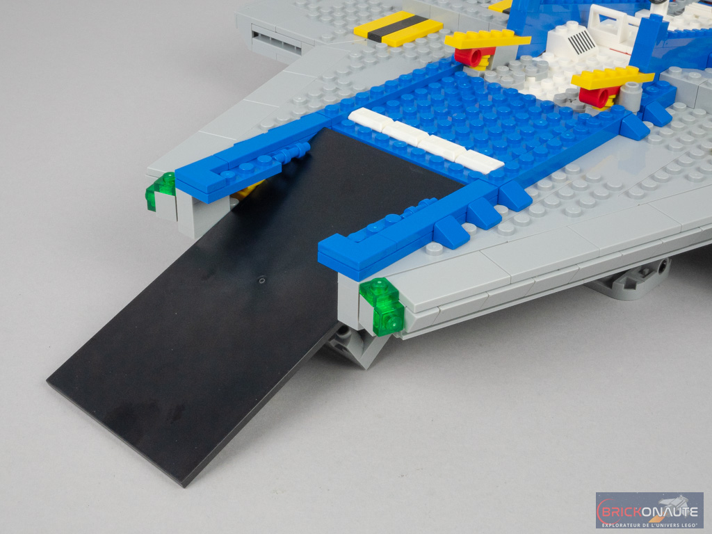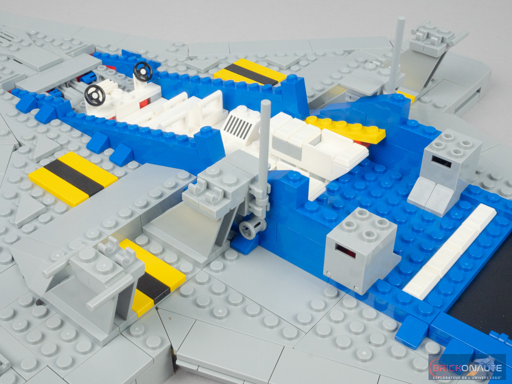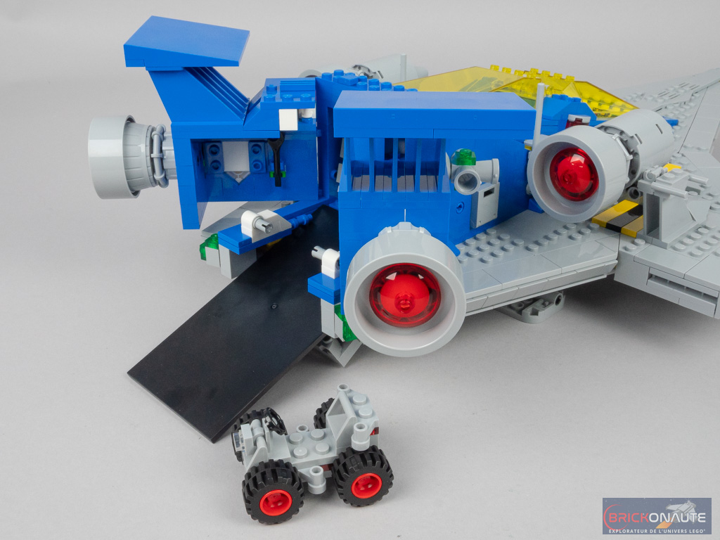 Si les fonctionnalités du set d’origine étaient assez limitées, ici c’est un véritable festival. Évidemment, les deux verrières s’ouvrent, mais il y a beaucoup d’autres choses : des trains d’atterrissage escamotables, une porte coulissante entre la soute et la cabine, soute qui abrite un petit buggy qu’on peut faire sortir à l’arrière.