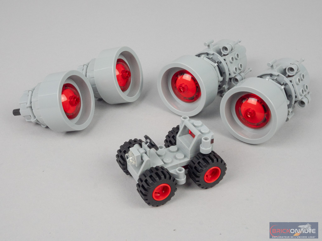 Après un peu plus de 3 heures, c’est (déjà !) le dernier sachet de pièces. Il nous sert à construire un total de 4 réacteurs. Deux petits sont fixés sur les éléments Technic à l’arrière de la soute, et les deux plus grands sur les supports des ailes. Ils sont détachables pour se transformer en petits véhicules d’exploration. On termine avec le buggy qui prend place dans la soute.