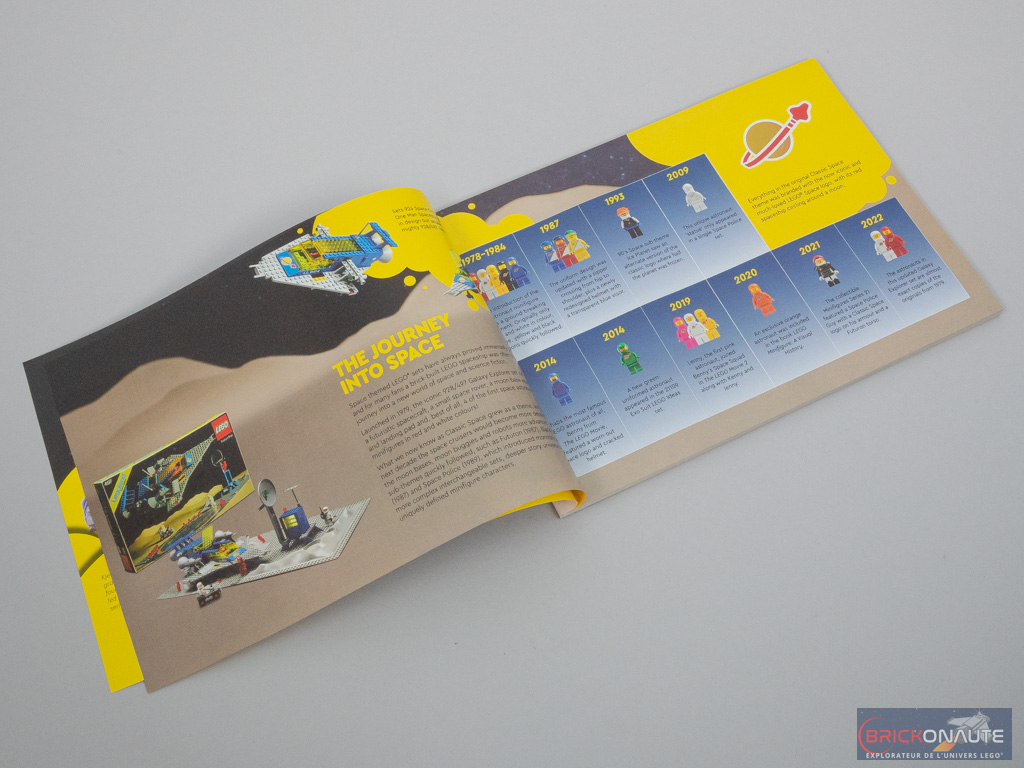 La boîte joue la nostalgie à fond en reprenant les « codes » de l’époque : une mise en scène de notre vaisseau à l’approche d’une planète inhabitée, deux spacemen ayant commencé leur exploration. Si le set de 1979 proposait 2 plaques de base avec une petite tour de contrôle, ce n’est pas le cas ici et le radar de cette dernière est remplacé par une lune dans le lointain. On retrouve même le bandeau jaune qui contient ici le nom du set et la mention Space System – ou encore la limite d’âge dans un petit rectangle blanc.