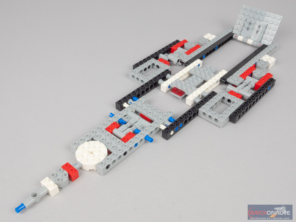 C’est la fonctionnalité « phare » de l’ensemble : en séparant les deux moitiés arrières (articulées sur des charnières), on ouvre la soute. En abaissant la partie basse, on peut alors libérer la grande tile noire en la faisant coulisser. Les roues du buggy peuvent alors passer sous les pins gris, et le faire descendre le long de la rampe. C’est extrêmement ingénieux et ça fonctionne à merveille.