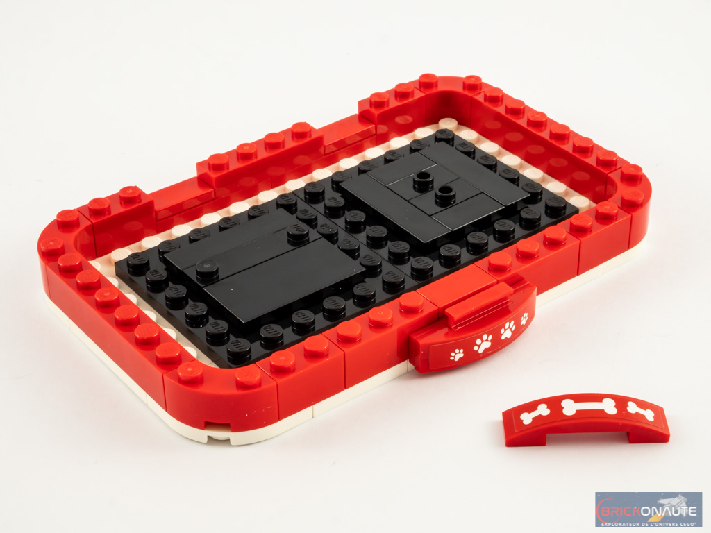 Là encore, nos deux animaux disposent d’un panier pour être exposé. Sa forme est très légèrement différente de celui des chats, mais la conception est identique. LEGO nous fournit deux slopes et deux autocollants au choix : des os, ou des traces de pattes.