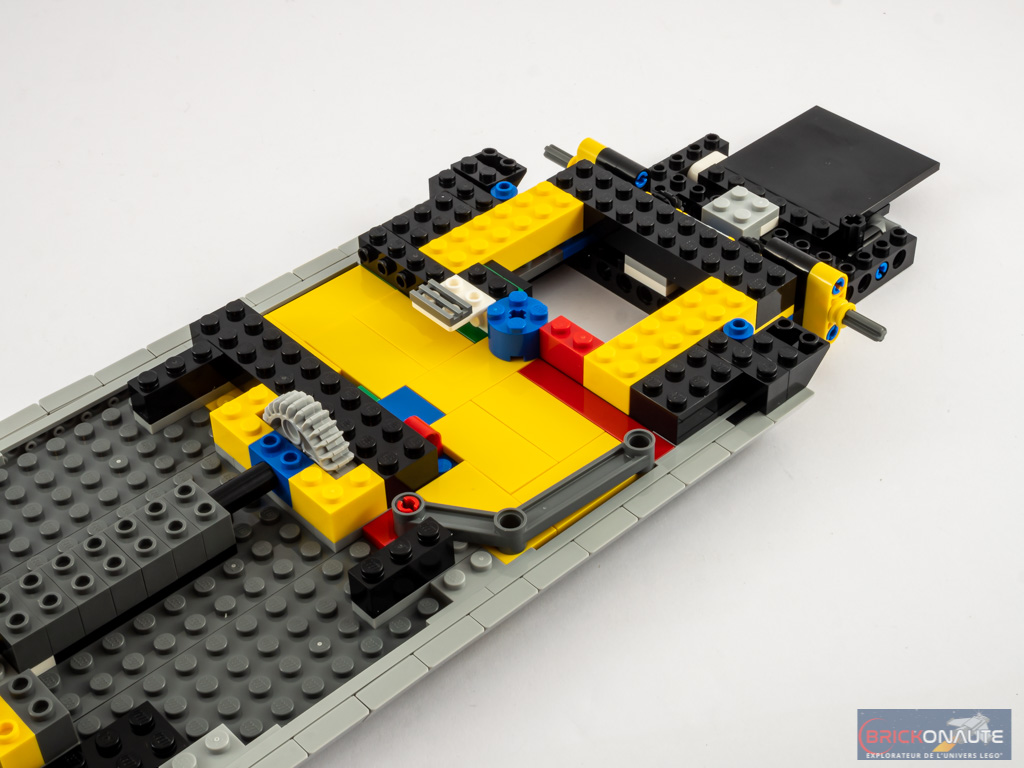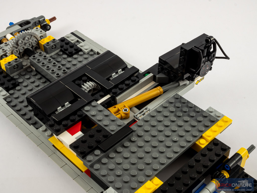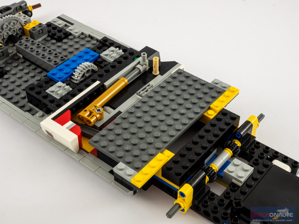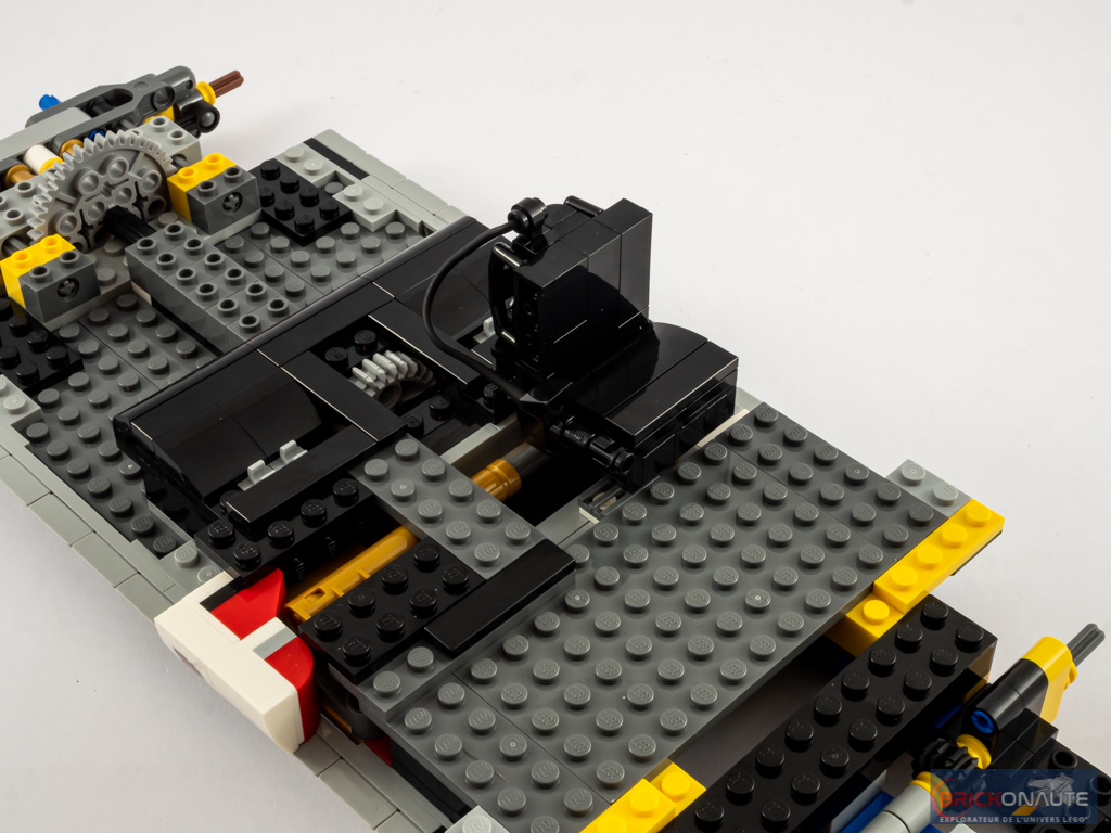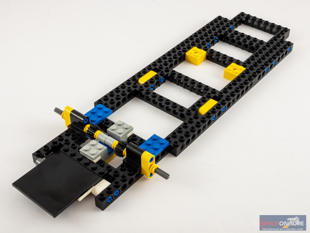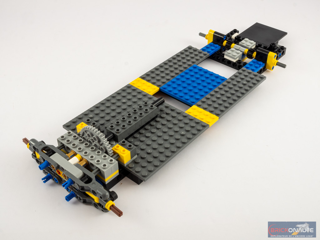 La construction commence, comme toujours avec les véhicules de ce gabarit, par le châssis réalisé à base d’éléments Technic. On y ajoute quelques plates pour le plancher, le mécanisme reliant la rotation des accessoires sur le toit avec celle des roues arrières, et le système de direction.