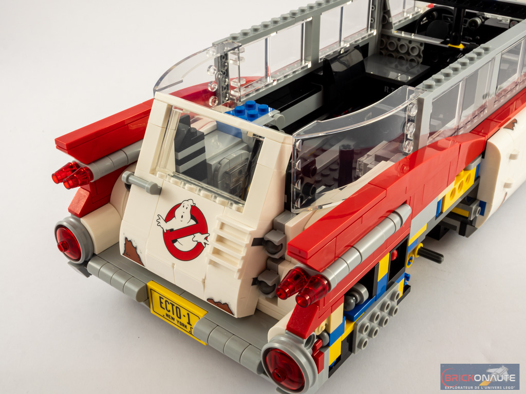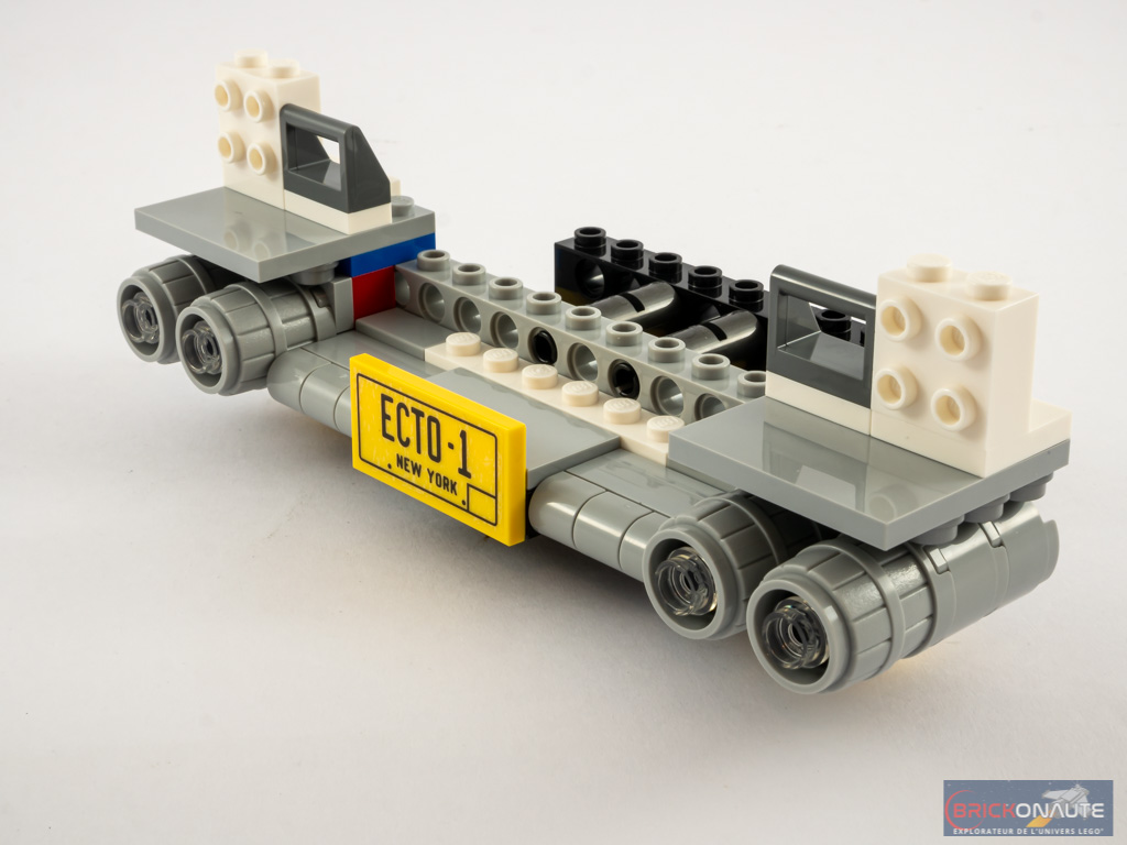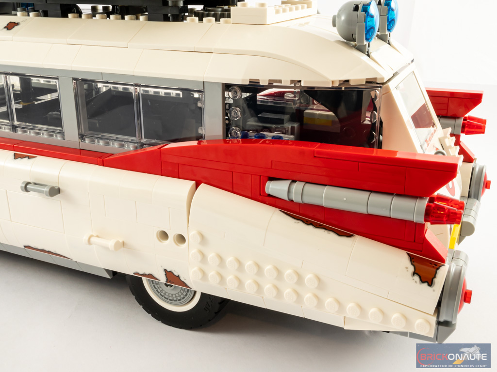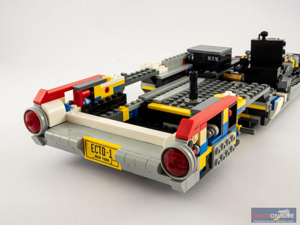 Nous continuons notre construction en ajoutant quelques appareils de chasseurs de fantômes à l’arrière de la voiture. Nous nous occupons ensuite d’assembler les deux empennages rouges. La manière d’intégrer les feux arrières est une franche réussite, les « tubes » gris étant légèrement proéminents. De grandes slopes rouges reproduisent plutôt fidèlement la forme si particulière de cette partie du véhicule.