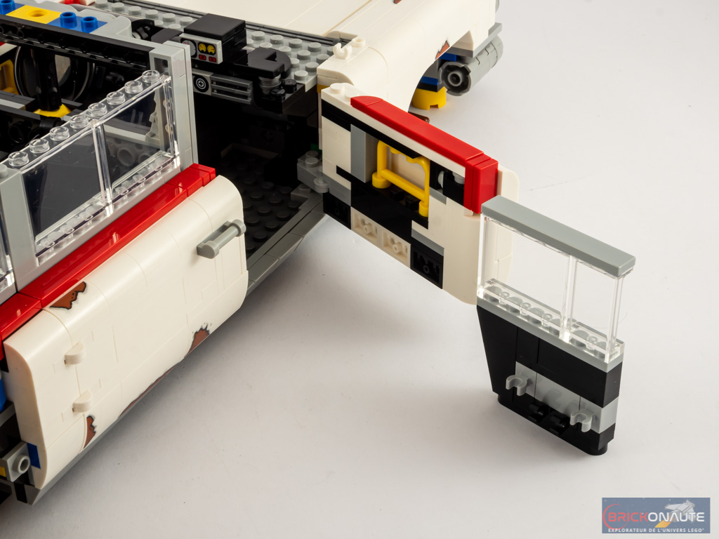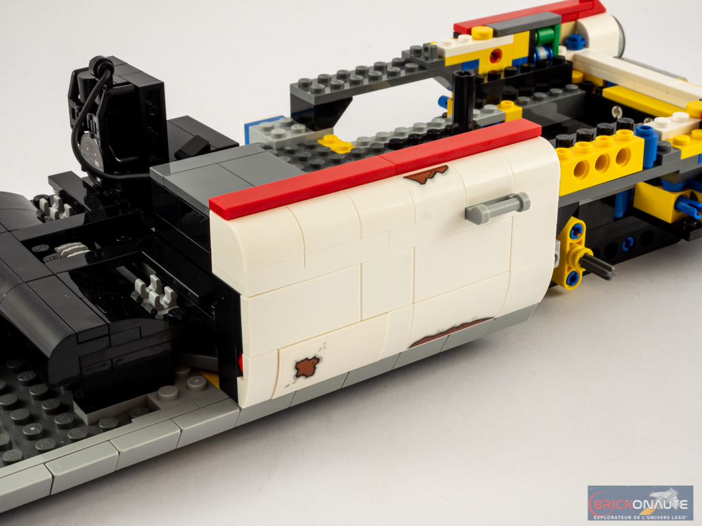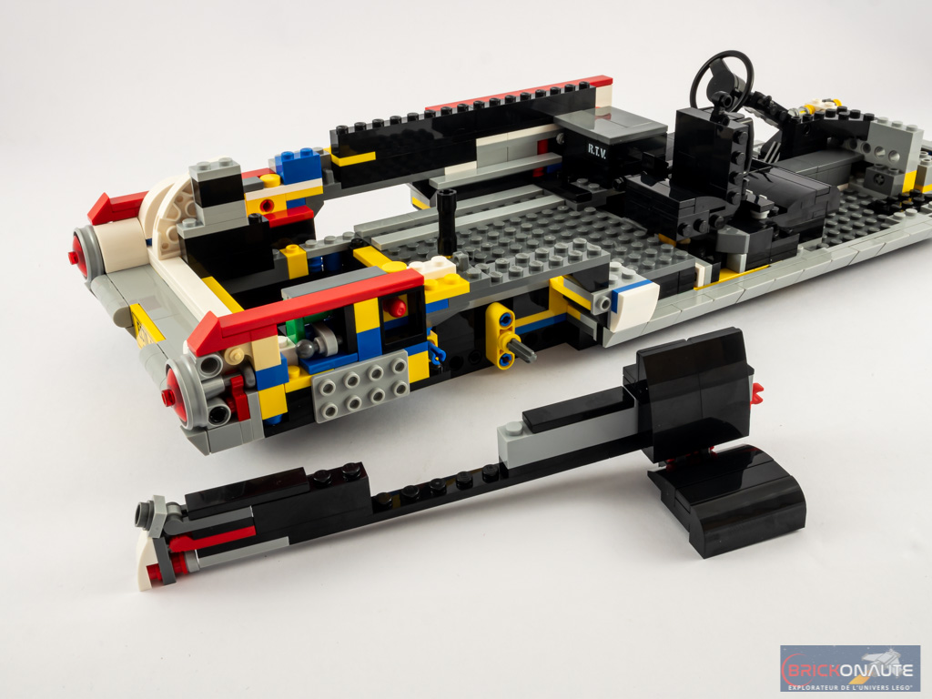 On ajoute alors deux grands sous-ensembles couverts de cheese slopes au niveau des bas de caisses. On prolonge l’axe de direction, et on construit le système qui permet au siège du mitrailleur de sortir par la porte arrière droite. En poussant sur un élément de carrosserie, un autre ensemble coulisse et un amortisseur (identique à ceux vus dans le set 42107 Ducati Panigale V4 R) permet la rotation du siège sur lui-même. C’est bien pensé, et ça fonctionne à merveille. Remarquez que le siège dispose d’une arme, identique à celle portée sur le dos des chasseurs de fantômes, et qui leur permet d’utiliser leur rayon (le fameux « Proton Pack »).