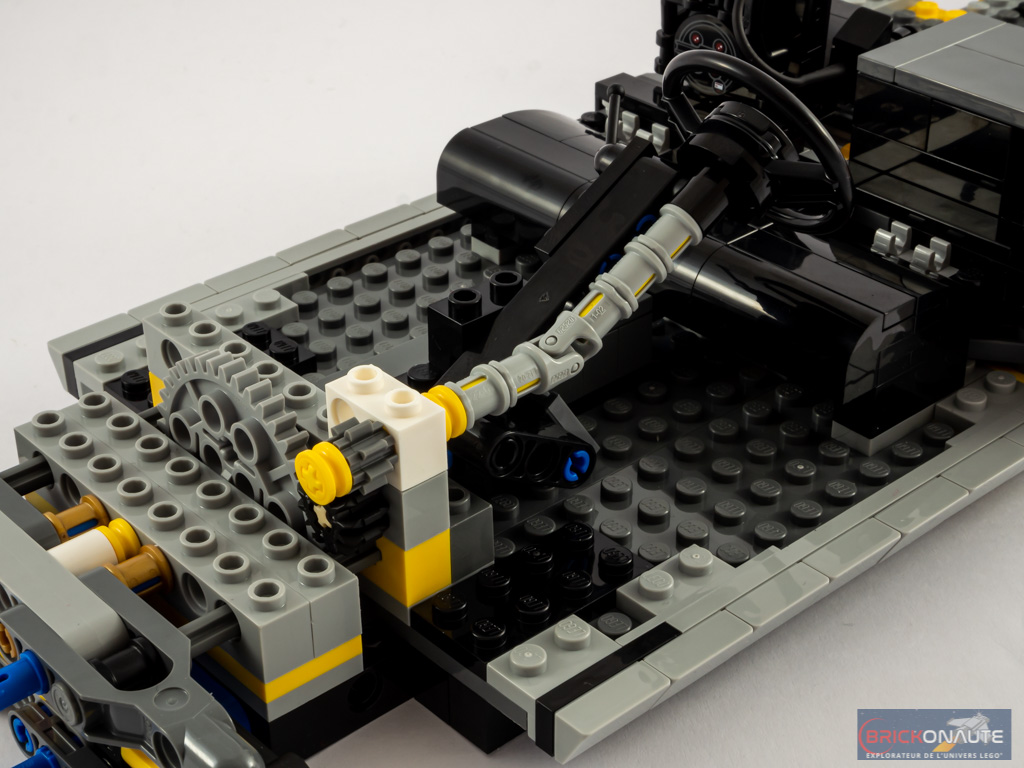 Nous continuons notre construction avec l’assemblage de la portière arrière gauche, qui n’en est pas vraiment une : elle ne s’ouvre pas. Nous nous occupons ensuite du volant et du système de direction, fonctionnelle comme sur le set 10265 Ford Mustang. Nous repassons alors à l’arrière où nous construisons le petit mécanisme qui permet d’éjecter la voiture téléguidée par une trappe située sous la voiture. Le siège arrière gauche est en effet fixé sur une « languette » qui coulisse et entraîne l’ouverture de la trappe, en tirant dessus depuis l’arrière. C’est très bien dissimulé, et très efficace. On termine cette étape avec un peu d’habillage pour dissimuler ledit mécanisme.