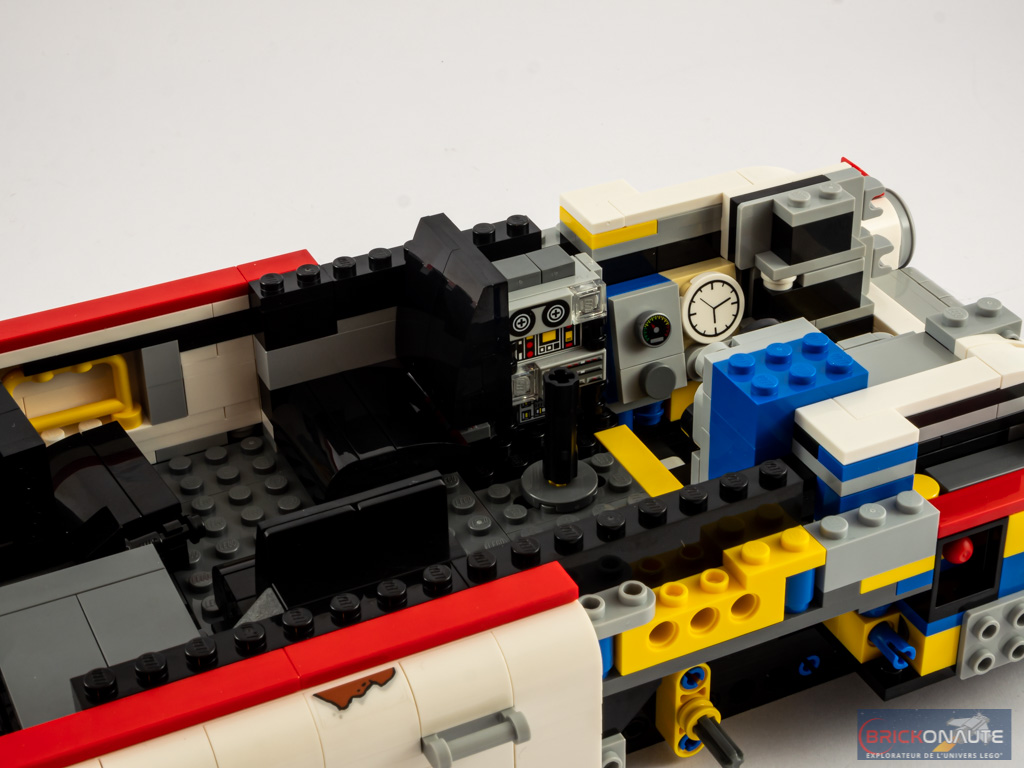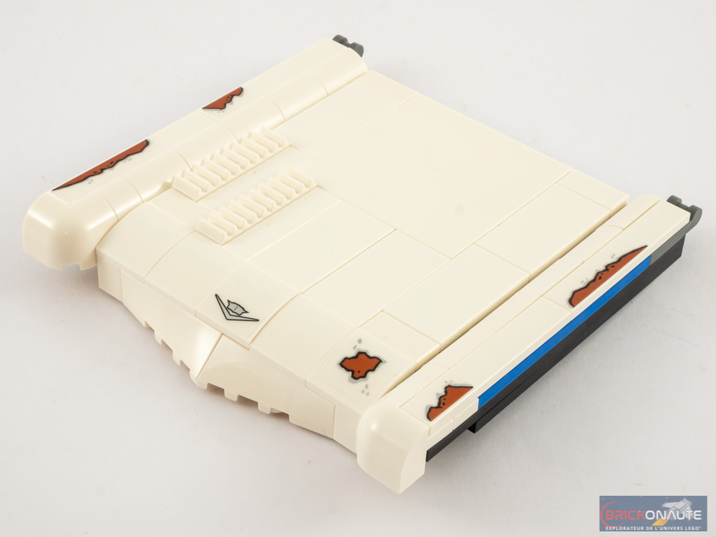 Nous continuons en construisant deux petits sous-ensembles qui sont fixés au-dessus de l’habitacle, puis nous attaquons le toit. La structure de celui-ci est à base de cadres et autres pièces Technic. On l’habille de slopes blanches de différentes tailles / formes et nous y intégrons un petit mécanisme. On le fixe (difficilement, les ensembles de cette taille ayant souvent un peu de « jeu ») puis on complète légèrement l’avant, ce qui achève cette étape.