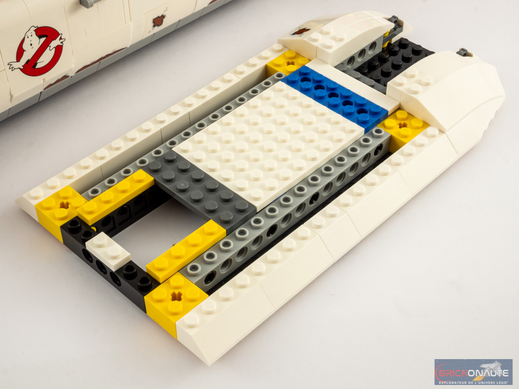 Nous entamons alors la dernière étape, avec pour commencer l’assemblage du gyrophare avant. S’ensuit la construction des deux ailes arrières, dont la conception est très bien pensée : ce sont deux ball joints qui permettent d’obtenir cet angle si particulier. Nous continuons avec différents accessoires : l’échelle, deux gros tubes bleus et quelques câbles. On termine avec le gyrophare arrière, un petit véhicule qui vient se planquer dans la trappe située dans le coffre, et un paquet de marshmallows Stay Puft.